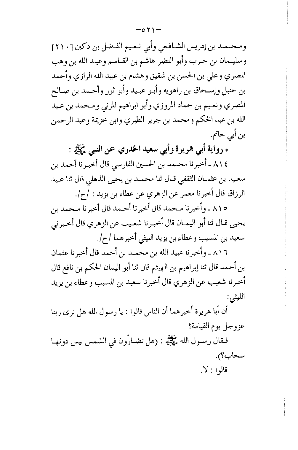 816 - وَأَخْبَرَنَا عُبَيْدُ اللَّهِ بْنُ مُحَمَّدِ بْنِ أَحْمَدَ، قَالَ: أَخْبَرَنَا عُثْمَانُ بْنُ أَحْمَدَ، قَالَ: ثَنَا إِبْرَاهِيمُ بْنُ الْهَيْثَمِ، قَالَ: ثَنَا أَبُو الْيَمَانِ الْحَكَمُ بْنُ نَافِعٍ، قَالَ: أَخْبَرَنَا شُعَيْبٌ، عَنِ الزُّهْرِيِّ، قَالَ: أَخْبَرَنَا سَعِيدُ بْنُ الْمُسَيِّبِ، وَعَطَاءُ بْنُ يَزِيدَ اللَّيْثِيُّ، أَنَّ أَبَا هُرَيْرَةَ، أَخْبَرَهُمَا أَنَّ النَّاسَ قَالُوا: يَا رَسُولَ اللَّهِ هَلْ §نَرَى رَبَّنَا عَزَّ وَجَلَّ يَوْمَ الْقِيَامَةِ؟ فَقَالَ رَسُولُ اللَّهِ صَلَّى اللهُ عَلَيْهِ وَسَلَّمَ: " هَلْ تُضَارُّونَ فِي الشَّمْسِ لَيْسَ دُونَهَا سَحَابٌ؟ قَالُوا: لَا , -[522]- قَالَ: " فَهَلْ تُمَارُونَ فِي الْقَمَرِ لَيْسَ دُونَهُ سَحَابٌ؟ قَالُوا: لَا يَا رَسُولَ اللَّهِ , قَالَ: فَإِنَّكُمْ تَرَوْنَهُ كَذَلِكَ " أَلْفَاظُهُمْ سَوَاءٌ أَخْرَجَهُ الْبُخَارِيُّ عَنْ أَبِي الْيَمَانِ وَمُسْلِمٌ عَنْ عَبْدِ اللَّهِ بْنِ عَبْدِ الرَّحْمَنِ السَّمَرْقَنْدِيُّ عَنْ أَبِي الْيَمَانِ