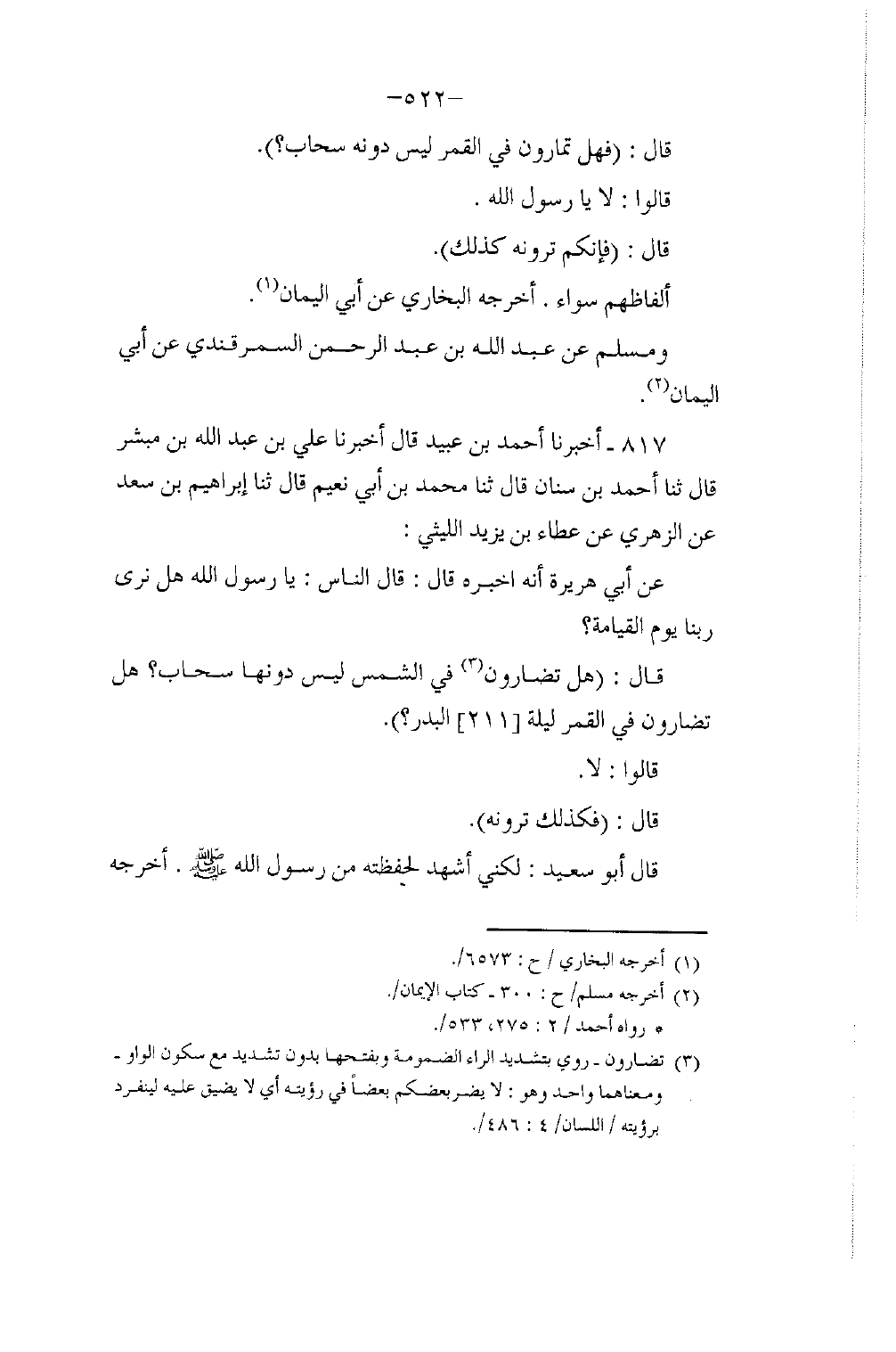 817 - أَخْبَرَنَا أَحْمَدُ بْنُ عُبَيْدٍ، قَالَ: أَخْبَرَنَا عَلِيُّ بْنُ عَبْدِ اللَّهِ بْنِ مُبَشِّرٍ، قَالَ: ثَنَا أَحْمَدُ بْنُ سِنَانٍ، قَالَ: ثَنَا مُحَمَّدُ بْنُ أَبِي نُعَيْمٍ، قَالَ: ثَنَا إِبْرَاهِيمُ بْنُ سَعْدٍ، عَنِ الزُّهْرِيِّ، عَنْ عَطَاءِ بْنِ يَزِيدَ اللَّيْثِيِّ، عَنْ أَبِي هُرَيْرَةَ، أَنَّهُ أَخْبَرَهُ قَالَ: قَالَ النَّاسُ: يَا رَسُولَ اللَّهِ §هَلْ نَرَى رَبَّنَا يَوْمَ الْقِيَامَةِ؟ قَالَ: " هَلْ تُضَارُّونَ فِي الشَّمْسِ لَيْسَ دُونَهَا سَحَابٌ؟ هَلْ تُضَارُّونَ فِي الْقَمَرِ لَيْلَةَ الْبَدْرِ؟ قَالُوا: لَا , قَالَ: فَكَذَلِكَ تَرَوْنَهُ " قَالَ أَبُو سَعِيدٍ لَكَنِّي أَشْهَدُ لَحَفِظْتُهُ مِنْ رَسُولِ اللَّهِ صَلَّى اللهُ عَلَيْهِ وَسَلَّمَ أَخْرَجَهُ -[523]- الْبُخَارِيُّ عَنْ عَبْدِ الْعَزِيزِ بْنِ عَبْدِ اللَّهِ عَنْ إِبْرَاهِيمَ وَمُسْلِمٍ , عَنْ زُهَيْرٍ , عَنْ يَعْقُوبَ بْنِ إِبْرَاهِيمَ بْنِ سَعْدٍ , عَنْ أَبِيهِ