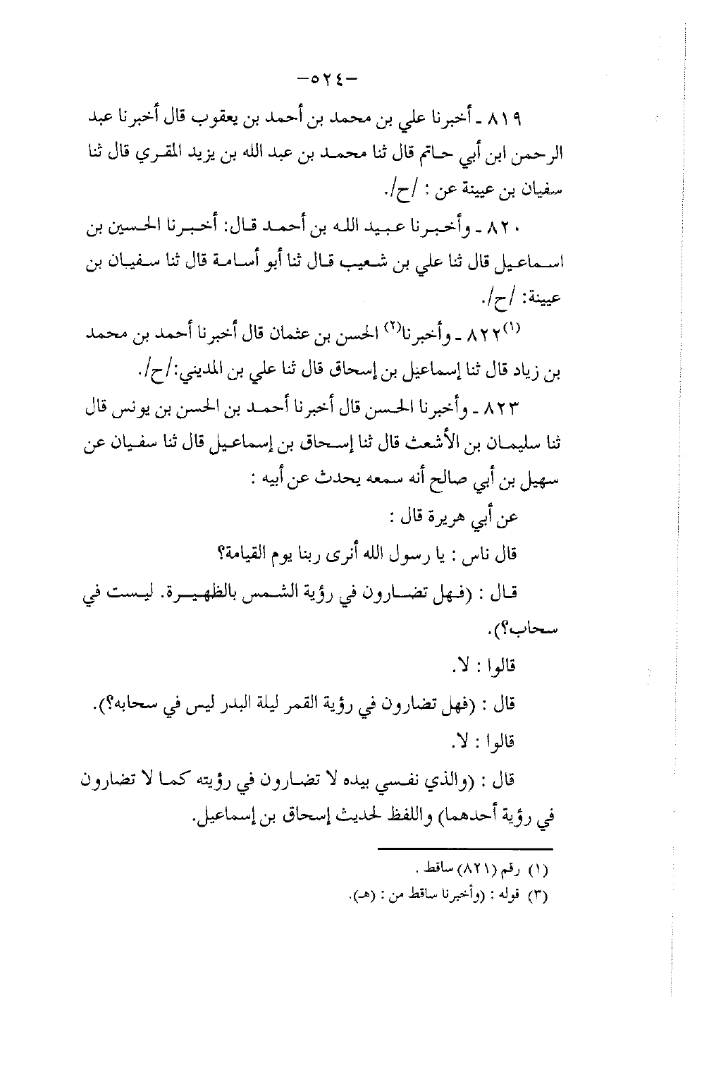 823 - وَأَخْبَرَنَا الْحَسَنُ، قَالَ: أَخْبَرَنَا أَحْمَدُ بْنُ الْحَسَنِ بْنِ يُونُسَ، قَالَ: ثَنَا سُلَيْمَانُ بْنُ الْأَشْعَثِ، قَالَ: ثَنَا إِسْحَاقُ بْنُ إِسْمَاعِيلَ، قَالَ: ثَنَا سُفْيَانُ، عَنْ سُهَيْلِ بْنِ أَبِي صَالِحٍ، أَنَّهُ سَمِعَهُ يُحَدِّثُ، عَنْ أَبِيهِ، عَنْ أَبِي هُرَيْرَةَ، قَالَ: قُلْنَا: يَا رَسُولَ اللَّهِ §أَنَرَى رَبَّنَا يَوْمَ الْقِيَامَةِ؟ قَالَ: " فَهَلْ تُضَارُّونَ فِي رُؤْيَةِ الشَّمْسِ بِالظَّهِيرَةِ لَيْسَتْ فِي سَحَابٍ؟ قَالُوا: لَا , قَالَ: فَهَلْ تُضَارُّونَ فِي رُؤْيَةِ الْقَمَرِ لَيْلَةَ الْبَدْرِ لَيْسَ فِي سَحَابَةٍ قَالُوا: لَا , قَالَ: وَالَّذِي نَفْسِي بِيَدِهِ لَا تُضَارُّونَ فِي رُؤْيَتِهِ كَمَا لَا تُضَارُّونَ فِي رُؤْيَةِ أَحَدِهِمَا " وَاللَّفْظُ لِحَدِيثِ إِسْحَاقَ بْنِ إِسْمَاعِيلَ -[525]- أَخْرَجَهُ مُسْلِمٌ فِي الصَّحِيحِ وَأَبُو دَاوُدَ فِي السُّنَنِ