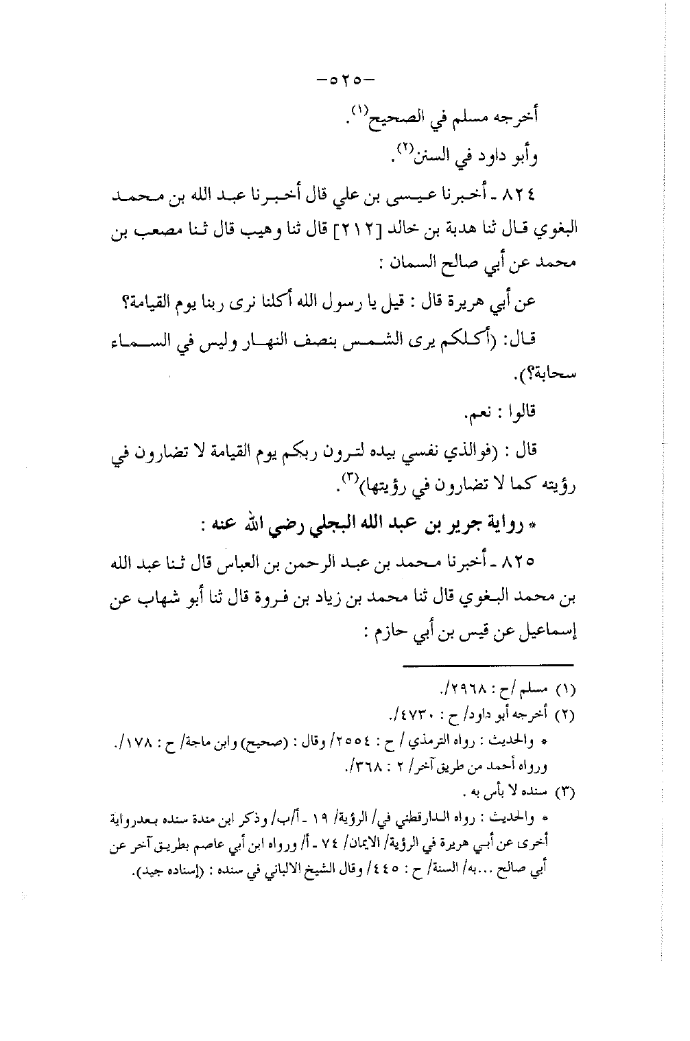 825 - أَخْبَرَنَا مُحَمَّدُ بْنُ عَبْدِ الرَّحْمَنِ بْنِ الْعَبَّاسِ، قَالَ: ثَنَا عَبْدُ اللَّهِ بْنُ مُحَمَّدٍ الْبَغَوِيُّ، قَالَ: ثَنَا مُحَمَّدُ بْنُ زِيَادِ بْنِ فَرْوَةَ، , قَالَ: ثَنَا أَبُو شِهَابٍ، عَنْ إِسْمَاعِيلَ، عَنْ قَيْسِ بْنِ أَبِي حَازِمٍ -[526]-، عَنْ جَرِيرِ بْنِ عَبْدِ اللَّهِ، قَالَ: كُنَّا عِنْدَ رَسُولِ اللَّهِ فَنَظَرَ إِلَى الْقَمَرِ لَيْلَةَ الْبَدْرِ فَقَالَ: §" إِنَّكُمْ سَتَرَوْنَ رَبَّكُمْ عَيَانًا كَمَا تَرَوْنَ هَذَا لَا تُضَامُونَ فِي رُؤْيَتِهِ فَإِنِ اسْتَطَعْتُمْ أَنْ لَا تُغْلَبُوا عَلَى صَلَاةٍ قَبْلَ طُلُوعِ الشَّمْسِ وَقَبْلَ غُرُوبِهَا وَقَرَأَ {وَسَبِّحْ بِحَمْدِ رَبِكَ قَبْلَ طُلُوعِ الشَّمْسِ وَقَبْلَ غُرُوبِهَا} [طه: 130] " أَخْرَجَهُ الْبُخَارِيُّ عَنْ يُوسُفَ بْنِ مُوسَى عَنْ عَاصِمِ بْنِ يُوسُفَ الْيَرْبُوعِيِّ عَنْ أَبِي شِهَابٍ بِهَذَا اللَّفْظِ فِي الصَّحِيحِ