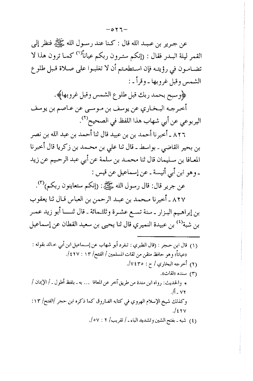 826 - أَخْبَرَنَا أَحْمَدُ بْنُ عُبَيْدٍ، قَالَ: ثَنَا أَحْمَدُ بْنُ عَبْدِ اللَّهِ بْنِ نَصْرِ بْنِ بَحِيرٍ الْقَاضِي، بِوَاسِطَ , قَالَ: ثَنَا عَلِيُّ بْنُ مُحَمَّدِ بْنِ زَكَرِيَّا، قَالَ: أَخْبَرَنَا الْمُعَافَى بْنُ سُلَيْمَانَ، قَالَ: ثَنَا مُحَمَّدُ بْنُ سَلَمَةَ، عَنْ أَبِي عَبْدِ الرَّحِيمِ، عَنْ زَيْدٍ وَهُوَ ابْنُ أَبِي أُنَيْسَةَ عَنْ إِسْمَاعِيلَ، عَنْ قَيْسٍ، عَنْ جَرِيرٍ، قَالَ: قَالَ رَسُولُ اللَّهِ صَلَّى اللهُ عَلَيْهِ وَسَلَّمَ: «إِنَّكُمْ §سَتُعَايِنُونَ رَبَّكُمْ»