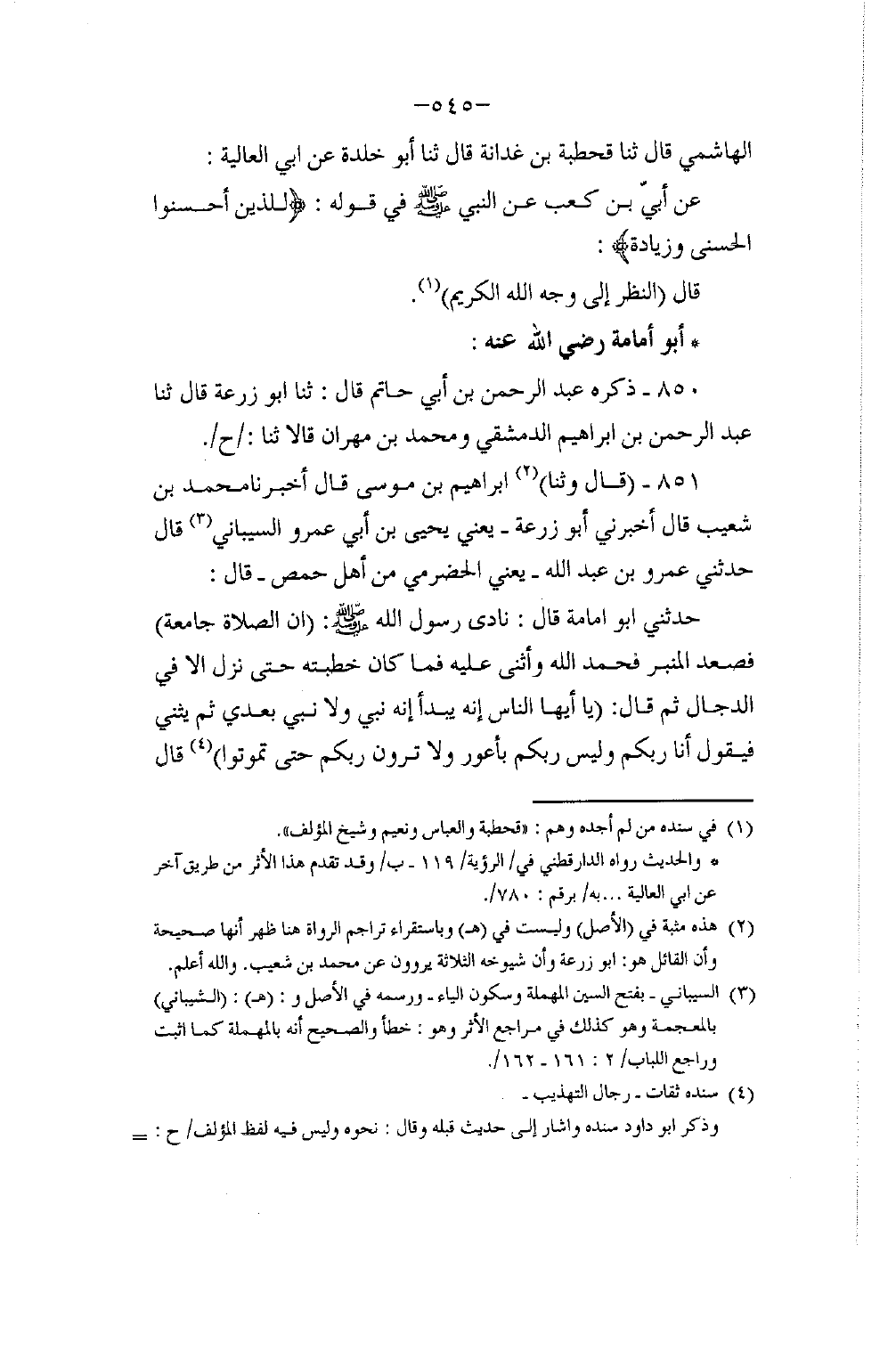 851 - قَالَ: وَثَنَا إِبْرَاهِيمُ بْنُ مُوسَى، قَالَ: أَخْبَرَنَا مُحَمَّدُ بْنُ شُعَيْبٍ، قَالَ: أَخْبَرَنِي أَبُو زُرْعَةَ يَعْنِي يَحْيَى بْنَ أَبِي عَمْرٍو السَّيْبَانِيَّ، قَالَ: حَدَّثَنِي عَمْرُو بْنُ عَبْدِ اللَّهِ يَعْنِي الْحَضْرَمِيَّ، مِنْ أَهْلِ حِمْصٍ قَالَ: حَدَّثَنِي أَبُو أُمَامَةَ قَالَ: نَادَى رَسُولُ اللَّهِ صَلَّى اللهُ عَلَيْهِ وَسَلَّمَ: «إِنَّ الصَّلَاةَ جَامِعَةٌ» , فَصَعِدَ الْمِنْبَرَ فَحَمِدَ اللَّهَ وَأَثْنَى عَلَيْهِ فَمَا كَانَ خُطْبَتُهُ حَتَّى نَزَلَ إِلَّا فِي الدَّجَّالِ ثُمَّ قَالَ: " يَا أَيُّهَا النَّاسُ إِنَّهُ يَبْدَأُ فَيَقُولُ: إِنَّهُ نَبِيٌّ وَلَا نَبِيَّ بَعْدِي ثُمَّ يُثَنِّي فَيَقُولُ: أَنَا رَبُّكُمْ , وَلَيْسَ رَبُّكُمْ بِأَعْوَرَ §وَلَا تَرَوْنَ رَبَّكُمْ حَتَّى تَمُوتُوا " قَالَ -[546]-: وَاللَّفْظُ لِحَدِيثِ عَبْدِ الرَّحْمَنِ