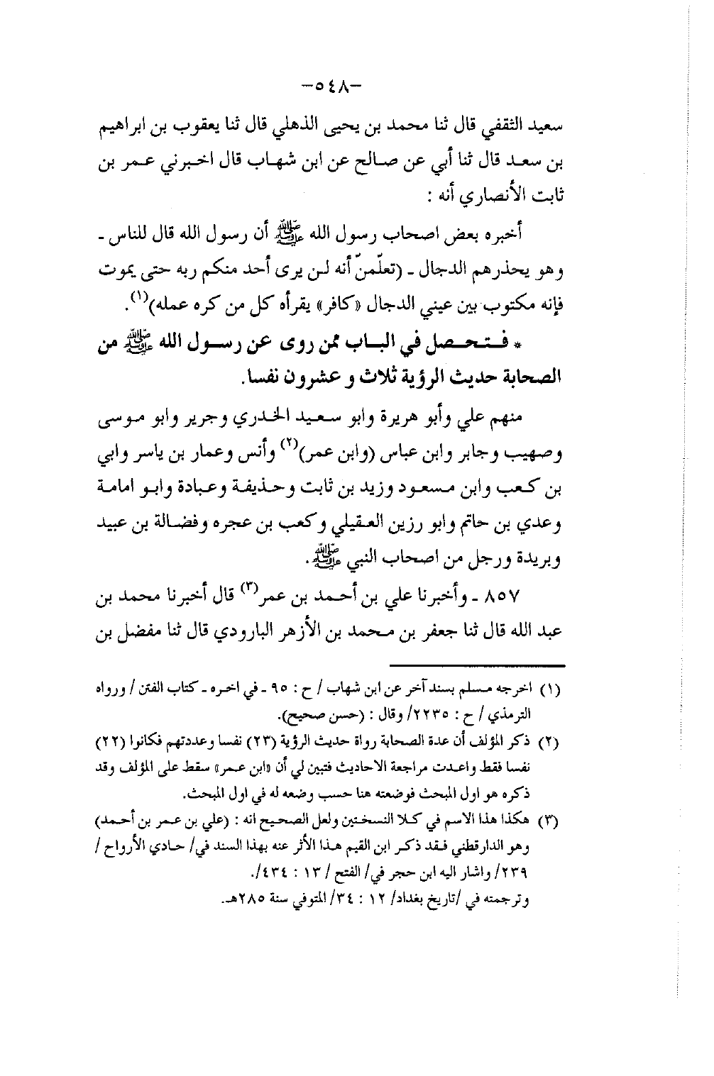 سَعِيدٍ الثَّقَفِيُّ، قَالَ: ثَنَا مُحَمَّدُ بْنُ يَحْيَى الذُّهْلِيُّ، قَالَ: ثَنَا يَعْقُوبُ بْنُ إِبْرَاهِيمَ بْنِ سَعْدٍ، قَالَ: ثَنَا أَبِي، عَنْ صَالِحٍ، عَنِ ابْنِ شِهَابٍ، قَالَ: أَخْبَرَنِي عُمَرُ بْنُ ثَابِتٍ الْأَنْصَارِيُّ، أَنَّهُ أَخْبَرَهُ بَعْضُ، أَصْحَابِ رَسُولِ اللَّهِ صَلَّى اللهُ عَلَيْهِ وَسَلَّمَ أَنَّ رَسُولَ اللَّهِ صَلَّى اللهُ عَلَيْهِ وَسَلَّمَ قَالَ لِلنَّاسِ وَهُوَ يُحَذِّرُهُمُ الدَّجَّالَ: §" تَعْلَمُنَّ أَنَّهُ لَنْ يَرَى أَحَدٌ مِنْكُمْ رَبَّهُ حَتَّى يَمُوتَ , فَإِنَّهُ مَكْتُوبٌ بَيْنَ عَيْنَيِ الدَّجَّالِ: كَافِرٌ , يَقْرَأُهُ كُلُّ مَنْ كَرِهَ عَمَلَهُ " فَتَحَصَّلَ فِي الْبَابِ مِمَّنْ رَوَى عَنْ رَسُولِ اللَّهِ صَلَّى اللهُ عَلَيْهِ وَسَلَّمَ مِنَ الصَّحَابَةِ حَدِيثَ الرُّؤْيَةِ ثَلَاثٌ وَعِشْرُونَ نَفْسًا مِنْهُمْ عَلِيٌّ، وَأَبُو هُرَيْرَةَ، وَأَبُو سَعِيدٍ الْخُدْرِيُّ، وَجَرِيرٌ، وَأَبُو مُوسَى، وَصُهَيْبٌ، وَجَابِرٌ، وَابْنُ عَبَّاسٍ، وَابْنُ عُمَرَ، وَأَنَسٌ، وَعَمَّارُ بْنُ يَاسِرٍ، وَأُبَيُّ بْنُ كَعْبٍ، وَابْنُ مَسْعُودٍ، وَزَيْدُ بْنُ ثَابِتٍ، وَحُذَيْفَةُ، وَعُبَادَةُ، وَأَبُو أُمَامَةَ، وَعَدِيُّ بْنُ حَاتِمٍ، وَأَبُو رَزِينٍ الْعُقَيْلِيُّ، وَكَعْبُ بْنُ عُجَرَةَ، وَفَضَالَةُ بْنُ عُبَيْدٍ، وَبُرَيْدَةُ، وَرَجُلٌ مِنْ أَصْحَابِ النَّبِيِّ صَلَّى اللهُ عَلَيْهِ وَسَلَّمَ