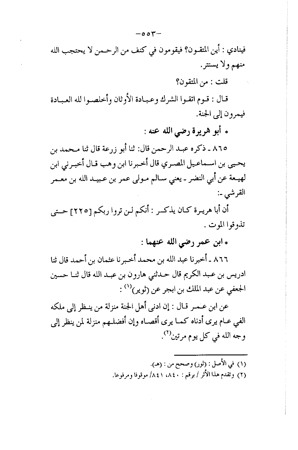 866 - أَخْبَرَنَا عَبْدُ اللَّهِ بْنُ مُحَمَّدٍ، أَخْبَرَنَا عُثْمَانُ بْنُ أَحْمَدَ، قَالَ: ثَنَا إِدْرِيسُ بْنُ عَبْدِ الْكَرِيمِ، قَالَ: حَدَّثَنِي هَارُونُ بْنُ عَبْدِ اللَّهِ، قَالَ: ثَنَا حُسَيْنٌ الْجُعْفِيُّ، عَنْ عَبْدِ الْمَلِكِ بْنِ أَبْجَرَ، عَنْ ثُوَيْرٍ، عَنِ ابْنِ عُمَرَ، قَالَ: «إِنَّ أَدْنَى أَهْلِ الْجَنَّةِ مَنْزِلَةً مَنْ يَنْظُرُ إِلَى مُلْكِهِ أَلْفَيْ عَامٍ، يَرَى أَدْنَاهُ كَمَا يَرَى أَقْصَاهُ , وَ §إِنَّ أَفْضَلَهُمْ مَنْزِلَةً لَمَنْ يَنْظُرُ إِلَى وَجْهِ اللَّهِ فِي كُلِّ يَوْمٍ مَرَّتَيْنِ» -[554]- قَوْلُ أَنَسِ بْنِ مَالِكٍ قَدْ مَضَى فِي التَّفْسِيرِ. مَا رُوِيَ عَنِ التَّابِعِينَ: قَدْ مَضَى عَنْ سَعِيدِ بْنِ الْمُسَيِّبِ، وَمُجَاهِدٍ، وَعَبْدِ الرَّحْمَنِ بْنِ أَبِي لَيْلَى، وَعَامِرِ بْنِ سَعْدٍ، وَعِكْرِمَةَ، وَقَتَادَةَ، وَعَبْدِ الرَّحْمَنِ بْنِ سَابِطٍ فِي تَفْسِيرِ الْآيَاتِ