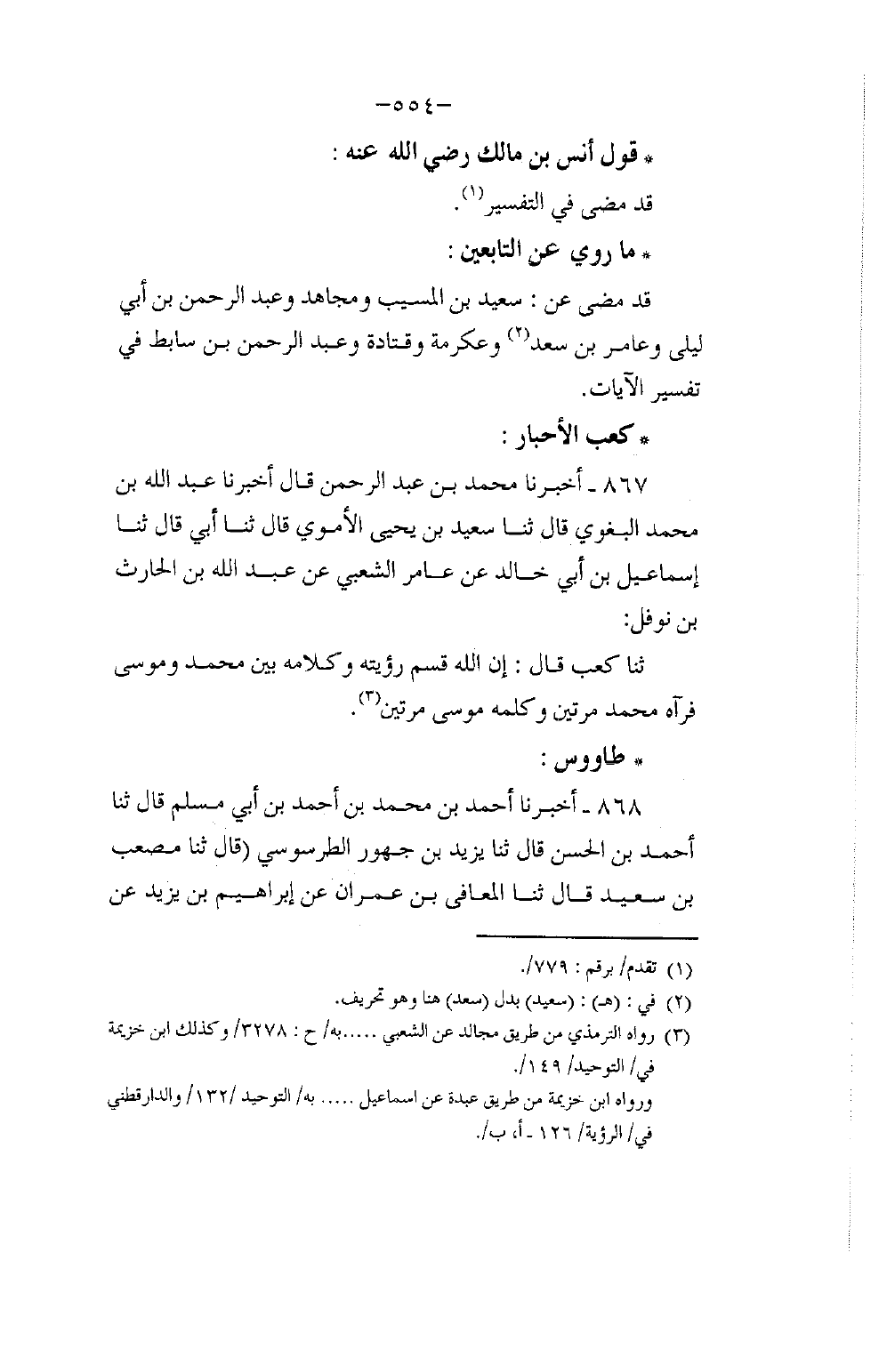 867 - أَخْبَرَنَا مُحَمَّدُ بْنُ عَبْدِ الرَّحْمَنِ، قَالَ: أَخْبَرَنَا عَبْدُ اللَّهِ بْنُ مُحَمَّدٍ الْبَغَوِيُّ، قَالَ: ثَنَا سَعِيدُ بْنُ يَحْيَى الْأُمَوِيُّ، قَالَ: ثَنَا أَبِي قَالَ: ثَنَا إِسْمَاعِيلُ بْنُ أَبِي خَالِدٍ، عَنْ عَامِرٍ الشَّعْبِيِّ، عَنْ عَبْدِ اللَّهِ بْنِ الْحَارِثِ بْنِ نَوْفَلٍ، ثَنَا كَعْبٌ، قَالَ: «إِنَّ §اللَّهَ قَسَمَ رُؤْيَتَهُ بَيْنَ مُحَمَّدٍ، وَمُوسَى، فَرَآهُ مُحَمَّدٌ مَرَّتَيْنِ، وَكَلَّمَهُ مُوسَى مَرَّتَيْنِ»