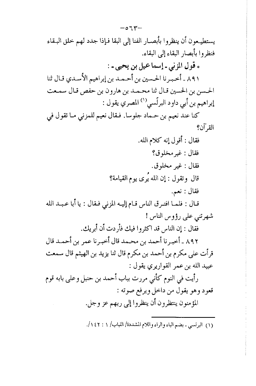 891 - أَخْبَرَنَا الْحُسَيْنُ بْنُ أَحْمَدَ بْنِ إِبْرَاهِيمَ الْأَسَدِيُّ، قَالَ: ثَنَا الْحَسَنُ بْنُ الْحُسَيْنِ، قَالَ: ثَنَا مُحَمَّدُ بْنُ هَارُونَ بْنِ حَفْصٍ، قَالَ: سَمِعْتُ إِبْرَاهِيمَ بْنَ أَبِي دَاوُدَ الْبُرُلُّسِيُّ الْمِصْرِيُّ، يَقُولُ: كُنَّا عِنْدَ نُعَيْمِ بْنِ حَمَّادٍ جُلُوسًا , فَقَالَ نُعَيْمٌ لِلْمُزَنِيِّ: مَا تَقُولُ فِي الْقُرْآنِ؟ فَقَالَ: أَقُولُ: إِنَّهُ كَلَامُ اللَّهِ , فَقَالَ غَيْرُ مَخْلُوقٍ؟ فَقَالَ: غَيْرُ مَخْلُوقٍ , قَالَ: وَتَقُولُ: §إِنَّ اللَّهَ يُرَى يَوْمَ الْقِيَامَةِ؟ فَقَالَ: نَعَمْ , قَالَ: فَلَمَّا افْتَرَقَ النَّاسُ قَامَ إِلَيْهِ الْمُزَنِيُّ فَقَالَ: يَا أَبَا عَبْدِ اللَّهِ شَهَّرْتَنِي عَلَى رُءُوسِ النَّاسِ , فَقَالَ: إِنَّ النَّاسَ قَدْ أَكْثَرُوا فِيكَ فَأَرَدْتُ أَنْ أُبَرِّئُكَ