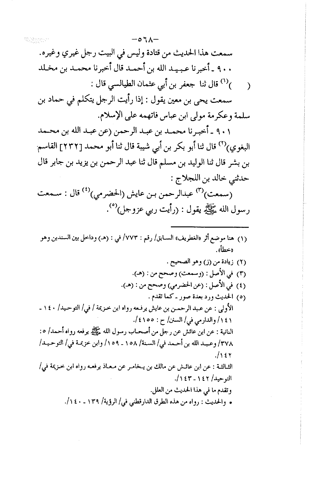 901 - أَخْبَرَنَا مُحَمَّدُ بْنُ عَبْدِ الرَّحْمَنِ، قَالَ: ثَنَا أَبُو بَكْرِ بْنُ أَبِي شَيْبَةَ، قَالَ: ثَنَا أَبُو مُحَمَّدٍ الْقَاسِمُ بْنُ بِشْرٍ، قَالَ: ثَنَا الْوَلِيدُ بْنُ مُسْلِمٍ، قَالَ: ثَنَا عَبْدُ الرَّحْمَنِ بْنُ يَزِيدَ بْنِ جَابِرٍ، قَالَ: حَدَّثَنِي خَالِدُ بْنُ اللَّجْلَاجِ، سَمِعْتُ عَبْدَ الرَّحْمَنِ بْنَ عَائِشٍ الْحَضْرَمِيَّ، قَالَ: سَمِعْتُ رَسُولَ اللَّهِ صَلَّى اللهُ عَلَيْهِ وَسَلَّمَ يَقُولُ: §«رَأَيْتُ رَبِّي عَزَّ وَجَلَّ»