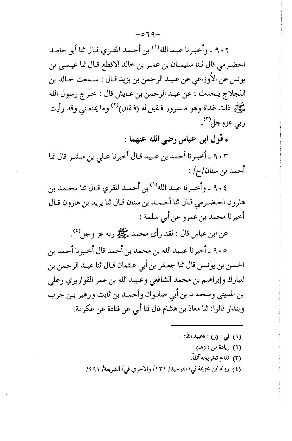 905 - أَخْبَرَنَا عُبَيْدُ اللَّهِ بْنُ مُحَمَّدِ بْنِ أَحْمَدَ، قَالَ: أَخْبَرَنَا أَحْمَدُ بْنُ الْحَسَنِ بْنِ يُونُسَ، قَالَ: ثَنَا جَعْفَرُ بْنُ أَبِي عُثْمَانَ، قَالَ: ثَنَا عَبْدُ الرَّحْمَنِ بْنُ الْمُبَارَكِ، وَإِبْرَاهِيمُ بْنُ مُحَمَّدٍ الشَّافِعِيُّ، وَعُبَيْدُ اللَّهِ بْنُ عُمَرَ الْقَوَارِيرِيُّ، وَعَلِيُّ بْنُ الْمَدِينِيِّ، وَمُحَمَّدُ بْنُ أَبِي صَفْوَانَ، وَأَحْمَدُ بْنُ ثَابِتٍ، وَزُهَيْرُ بْنُ حَرْبٍ، وَبُنْدَارُ، قَالُوا ثَنَا مُعَاذُ بْنُ هِشَامٍ، قَالَ: ثَنَا أَبِي، عَنْ قَتَادَةَ، عَنْ عِكْرِمَةَ -[570]-، عَنِ ابْنِ عَبَّاسٍ، قَالَ: «أَتَعْجَبُونَ أَنْ تَكُونَ الْخِلَّةُ لِإِبْرَاهِيمَ وَالْكَلَامُ لِمُوسَى §وَالرُّؤْيَةُ لِمُحَمَّدٍ صَلَّى اللهُ عَلَيْهِ وَسَلَّمَ؟»