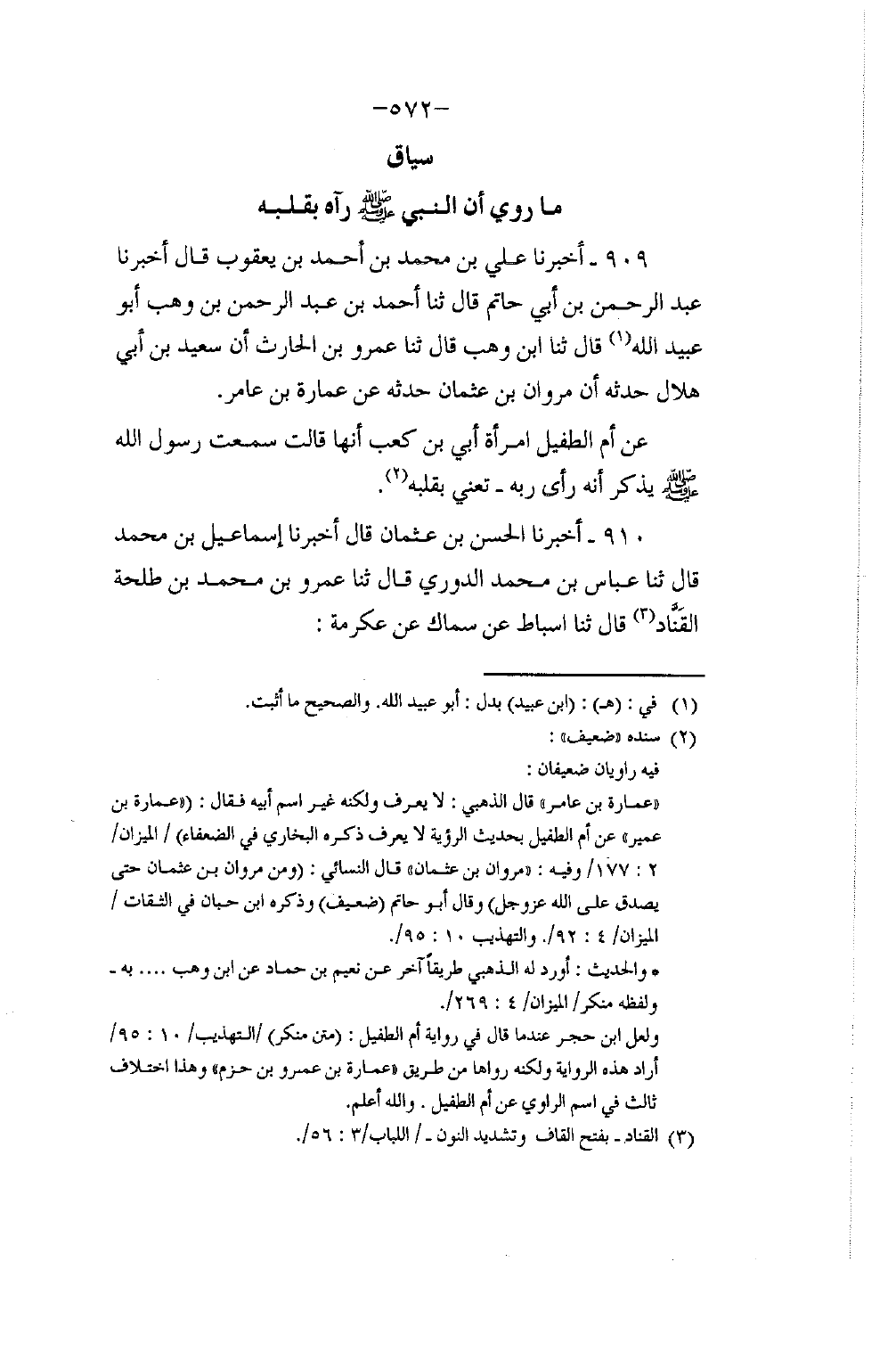 909 - أَخْبَرَنَا عَلِيُّ بْنُ مُحَمَّدِ بْنِ أَحْمَدَ بْنِ يَعْقُوبَ، قَالَ: أَخْبَرَنَا عَبْدُ الرَّحْمَنِ بْنُ أَبِي حَاتِمٍ، قَالَ: ثَنَا أَحْمَدُ بْنُ عَبْدِ الرَّحْمَنِ بْنِ وَهْبٍ أَبُو عُبَيْدِ اللَّهِ، قَالَ: ثنا ابْنُ وَهْبٍ، قَالَ: ثَنَا عَمْرُو بْنُ الْحَارِثِ بْنِ سَعِيدِ بْنِ أَبِي هِلَالٍ، حَدَّثَهُ أَنَّ مَرْوَانَ بْنَ عُثْمَانَ حَدَّثَهُ عَنْ عُمَارَةَ بْنِ عَامِرٍ، عَنْ أُمِّ الطُّفَيْلِ، امْرَأَةُ أُبَيِّ بْنِ كَعْبٍ أَنَّهَا قَالَتْ: «سَمِعْتُ رَسُولَ اللَّهِ صَلَّى اللهُ عَلَيْهِ وَسَلَّمَ يَذْكُرُ أَنَّهُ §رَأَى رَبَّهُ , تَعْنِي بِقَلْبِهِ»