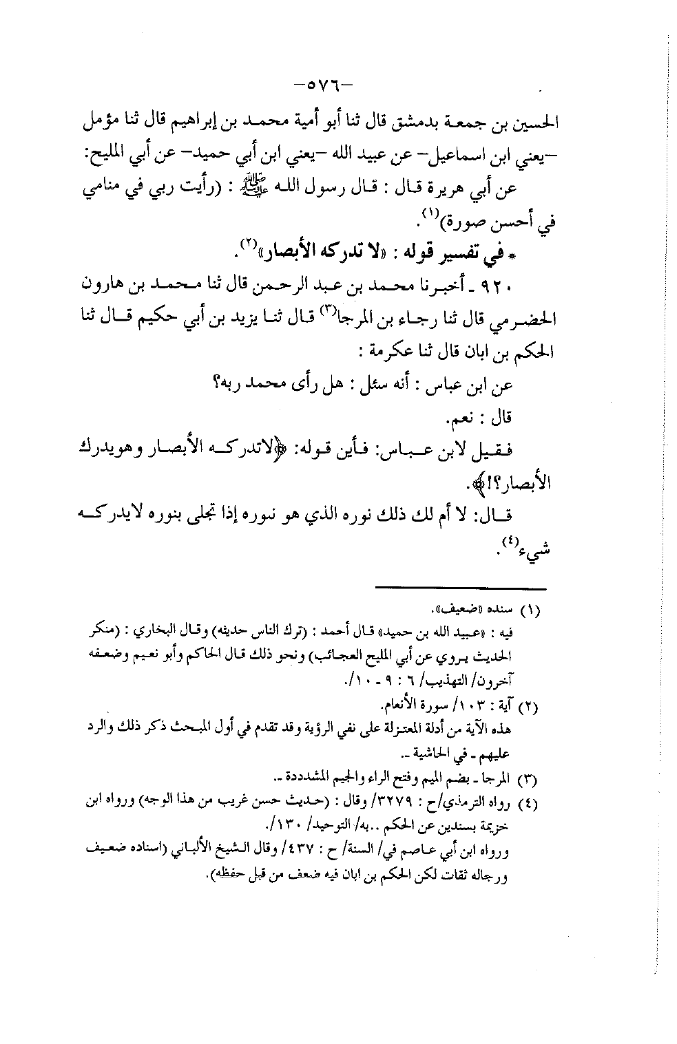 920 - أَخْبَرَنَا مُحَمَّدُ بْنُ عَبْدِ الرَّحْمَنِ، قَالَ: ثَنَا مُحَمَّدُ بْنُ هَارُونَ الْحَضْرَمِيُّ، قَالَ: ثَنَا رَجَاءُ بْنُ الْمُرَجَّا، قَالَ: ثَنَا يَزِيدُ بْنُ أَبِي حَكِيمٍ، قَالَ: ثَنَا الْحَكَمُ بْنُ أَبَانَ، قَالَ: ثَنَا عِكْرِمَةُ، عَنِ ابْنِ عَبَّاسٍ، أَنَّهُ سُئِلَ: هَلْ رَأَى مُحَمَّدٌ رَبَّهُ؟ قَالَ: نَعَمْ , فَقِيلَ لِابْنِ عَبَّاسٍ: فَأَيْنَ قَوْلُهُ {لَا تُدْرِكُهُ الْأَبْصَارُ وَهُوَ يُدْرِكُ الْأَبْصَارَ} [الأنعام: 103] قَالَ: «لَا أُمَّ لَكَ ذَلِكَ نُورُهُ الَّذِي هُوَ نُورُهُ إِذَا تَجَلَّى بِنُورِهِ §لَا يُدْرِكَهُ شَيْءٌ»