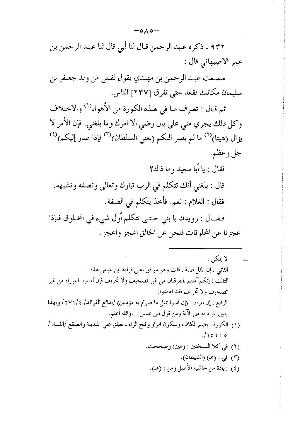 932 - ذَكَرَهُ عَبْدُ الرَّحْمَنِ قَالَ: ثَنَا أَبِي قَالَ: ثَنَا عَبْدُ الرَّحْمَنِ بْنُ عُمَرَ الْأَصْبَهَانِيُّ، قَالَ: سَمِعْتُ عَبْدَ الرَّحْمَنِ بْنَ مَهْدِيٍّ، يَقُولُ لِفَتًى مِنْ وَلَدِ جَعْفَرِ بْنِ سُلَيْمَانَ: مَكَانَكَ , فَقَعَدَ حَتَّى تَفَرَّقَ النَّاسُ , ثُمَّ قَالَ: تَعْرِفُ مَا فِي هَذِهِ الْكُورَةِ مِنَ الْأَهْوَاءِ وَالِاخْتِلَافِ وَكُلُّ ذَلِكَ يَجْرِي مِنِّي عَلَى بَالٍ رَضِيٍّ إِلَّا أَمَرَكَ وَمَا بَلَغَنِي , فَإِنَّ الْأَمْرَ لَا يَزَالُ هَيِّنَا مَا لَمْ يَصِرْ إِلَيْكُمْ , يَعْنِي السُّلْطَانَ , فَإِذَا صَارَ إِلَيْكُمْ , جَلَّ وَعَظُمَ , فَقَالَ: يَا أَبَا سَعِيدٍ وَمَا ذَاكَ؟ قَالَ: بَلَغَنِي أَنَّكَ تَتَكَلَّمُ فِي الرَّبِّ تَبَارَكَ وَتَعَالَى وَتَصِفُهُ وَتُشَبِّهُهُ , فَقَالَ الْغُلَامُ: نَعَمْ , فَأَخَذَ يَتَكَلَّمُ فِي الصِّفَةِ , فَقَالَ: رُوَيْدَكَ يَا بُنَيَّ حَتَّى نَتَكَلَّمَ أَوَّلَ شَيْءٍ فِي الْمَخْلُوقِ , فَإِذَا عَجَزْنَا عَنِ الْمَخْلُوقَاتِ , فَنَحْنُ عَنِ الْخَالِقِ أَعْجَزُ وَأَعْجَزُ " -[586]-. أَخْبَرَنِي عَنْ حَدِيثٍ حَدَّثَنِيهِ شُعْبَةُ عَنِ الشَّيْبَانِيِّ قَالَ: سَمِعْتُ زِرًّا قَالَ: قَالَ عَبْدُ اللَّهِ " فِي قَوْلِهِ {§لَقَدْ رَأَى مِنْ آيَاتِ رَبِّهِ الْكُبْرَى} [النجم: 18] قَالَ: رَأَى جِبْرِيلَ لَهُ سِتِّمِائَةِ جَنَاحٍ ". قَالَ: نَعَمْ , فَعَرَفَ الْحَدِيثَ , فَقَالَ عَبْدُ الرَّحْمَنِ صَفْ لِي خَلْقًا مِنْ خَلْقِ اللَّهِ لَهُ سِتِّمِائَةِ جَنَاحٍ , فَبَقِيَ الْغُلَامُ يَنْظُرُ إِلَيْهِ , فَقَالَ عَبْدُ الرَّحْمَنِ: يَا بُنَيَّ، فَإِنِّي أُهَوِّنُ عَلَيْكَ الْمَسْأَلَةَ، وَأَضَعُ عَنْكَ خَمْسَمِائَةٍ وَسَبْعَةٍ وَتِسْعِينَ , صَفْ لِي خَلْقًا بِثَلَاثَةِ أَجْنِحَةٍ رُكِّبَ الْجَنَاحُ الثَّالِثُ مِنْهُ مَوْضِعًا غَيْرَ الْمَوْضِعَيْنِ اللَّذَيْنِ رَكَّبَهُمَا اللَّهُ , حَتَّى أَعْلَمَ. فَقَالَ: يَا أَبَا سَعِيدٍ، نَحْنُ قَدْ عَجَزْنَا عَنْ صِفَةِ الْمَخْلُوقِ وَنَحْنُ عَنْ صِفَةِ الْخَالِقِ أَعْجَزُ وَأَعْجَزُ , فَأُشْهِدُكَ أَنِّي قَدْ رَجَعْتُ عَنْ ذَلِكَ وَأَسْتَغْفِرُ اللَّهَ