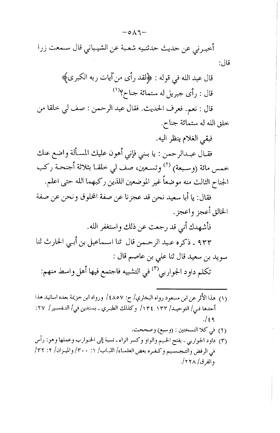 933 - ذَكَرَهُ عَبْدُ الرَّحْمَنِ قَالَ: ثَنَا إِسْمَاعِيلُ بْنُ أَبِي الْحَارِثِ، ثَنَا سُوَيْدُ بْنُ سَعِيدٍ، قَالَ: ثَنَا عَلِيُّ بْنُ عَاصِمٍ، قَالَ: §تَكَلَّمَ دَاوُدُ الْجَوَارِبِيُّ فِي التَّشْبِيهِ فَاجْتَمَعَ فِيهَا أَهْلُ وَاسِطٍ , مِنْهُمْ -[587]- مُحَمَّدُ بْنُ يَزِيدَ، وَخَالِدٌ الطَّحَّانُ، وَهُشَيْمٌ، وَغَيْرُهُمْ , فَأَتَوُا الْأَمِيرَ وَأَخْبَرُوهُ بِمَقَالَتِهِ , فَأَجْمَعُوا عَلَى سَفْكِ دَمِهِ , فَمَاتَ فِي أَيَّامِهِ , فَلَمْ يُصَلِّ عَلَيْهِ عُلَمَاءُ أَهْلِ وَاسِطٍ