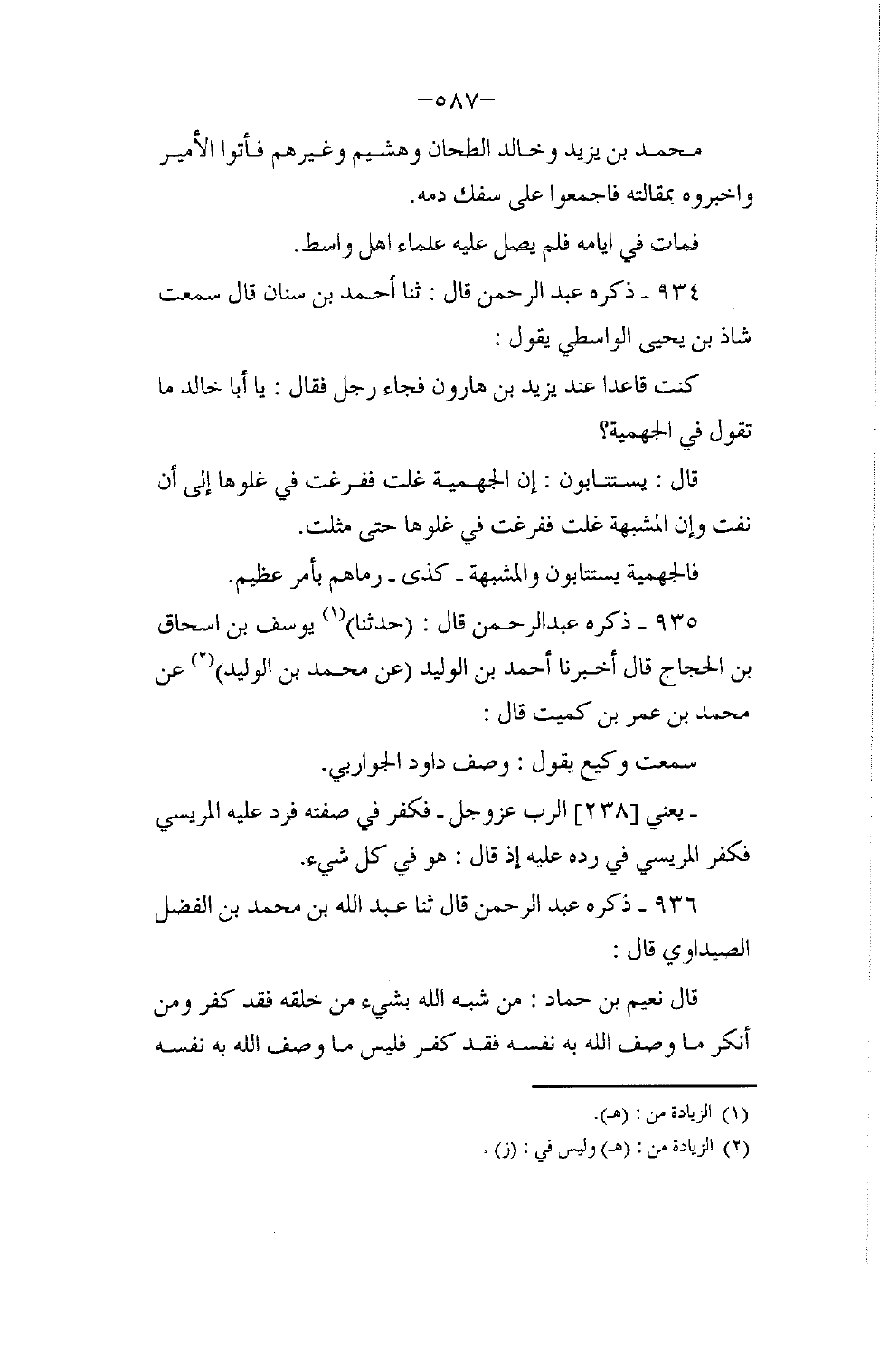 934 - ذَكَرَهُ عَبْدُ الرَّحْمَنِ قَالَ: ثَنَا أَحْمَدُ بْنُ سِنَانٍ، قَالَ: سَمِعْتُ شَاذَ بْنَ يَحْيَى الْوَاسِطِيَّ، يَقُولُ: " كُنْتُ قَاعِدًا عِنْدَ يَزِيدَ بْنِ هَارُونَ , فَجَاءَ رَجُلٌ فَقَالَ: يَا أَبَا خَالِدٍ مَا تَقُولُ فِي الْجَهْمِيَّةِ؟ قَالَ: «§يُسْتَتَابُونَ , إِنَّ الْجَهْمِيَّةَ غَلَتْ فَفَرَغَتْ فِي غُلُوِّهَا إِلَى أَنْ نَفَتْ , وَإِنَّ الْمُشَبِّهَةَ غَلَتْ فَفَرَغَتْ فِي غُلُوِّهَا حَتَّى مَثَّلَتْ , فَالْجَهْمِيَّةُ يُسْتَتَابُونَ , وَالْمُشَبِّهَةُ كَذِي , رَمَاهُمْ بِأَمْرٍ عَظِيمٍ»