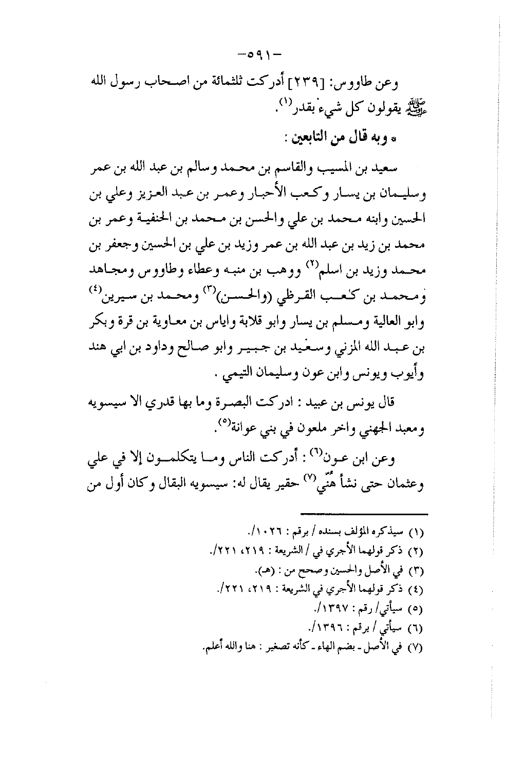 وَعَنْ طَاوُسٍ: أَدْرَكْتُ ثَلَاثَمِائَةٍ مِنْ أَصْحَابِ رَسُولِ اللَّهِ صَلَّى اللهُ عَلَيْهِ وَسَلَّمَ يَقُولُونَ: كُلُّ شَيْءٍ بِقَدَرٍ وَبِهِ قَالَ مِنَ التَّابِعِينَ: سَعِيدُ بْنُ الْمُسَيِّبِ، وَالْقَاسِمُ بْنُ مُحَمَّدٍ، وَسَالِمُ بْنُ عَبْدِ اللَّهِ بْنِ عُمَرَ، وَسُلَيْمَانُ بْنُ يَسَارٍ، وَكَعْبُ الْأَحْبَارِ، وَعُمَرُ بْنُ عَبْدِ الْعَزِيزِ، وَعَلِيُّ بْنُ الْحُسَيْنِ، وَابْنُهُ مُحَمَّدُ بْنُ عَلِيٍّ، وَالْحَسَنُ بْنُ مُحَمَّدِ ابْنِ الْحَنَفِيَّةِ، وَعُمَرُ بْنُ مُحَمَّدِ بْنِ زَيْدِ بْنِ عَبْدِ اللَّهِ بْنِ عُمَرَ، وَزَيْدُ بْنُ عَلِيِّ بْنِ الْحُسَيْنِ، وَجَعْفَرُ بْنُ مُحَمَّدٍ، وَزَيْدُ بْنُ أَسْلَمَ، وَوَهْبُ بْنُ مُنَبِّهٍ، وَعَطَاءٌ، وَطَاوُسٌ، وَمُجَاهِدٌ، وَمُحَمَّدُ بْنُ كَعْبٍ الْقُرَظِيُّ، وَالْحَسَنُ، وَمُحَمَّدُ بْنُ سِيرِينَ، وَأَبُو الْعَالِيَةِ، وَمُسْلِمُ بْنُ يَسَارٍ، وَأَبُو قِلَابَةَ، وَإِيَاسُ بْنُ مُعَاوِيَةَ بْنِ قُرَّةَ، وَبَكْرُ بْنُ عَبْدِ اللَّهِ الْمُزَنِيُّ، وَسَعِيدُ بْنُ جُبَيْرٍ، وَأَبُو صَالِحٍ، وَدَاوُدُ بْنُ أَبِي هِنْدٍ، وَأَيُّوبُ، وَيُونُسُ، وَابْنُ عَوْنٍ، وَسُلَيْمَانُ التَّيْمِيُّ قَالَ يُونُسُ بْنُ عُبَيْدٍ: أَدْرَكْتُ الْبَصْرَةَ وَمَا بِهَا قَدَرِيٌّ إِلَّا سِيسَوَيْهِ وَمَعْبَدٌ الْجُهَنِيُّ وَآخَرُ مَلْعُونٌ فِي بَنِي عَوَانَةَ وَعَنِ ابْنِ عَوْنٍ: أَدْرَكْتُ النَّاسَ وَمَا يَتَكَلَّمُونَ إِلَّا فِي عَلِيٍّ وَعُثْمَانَ، حَتَّى نَشَأَ هُنَيٌّ حَقِيرٌ يُقَالُ لَهُ: سِيسَوَيْهِ الْبَقَّالُ، وَكَانَ أَوَّلَ مَنْ
