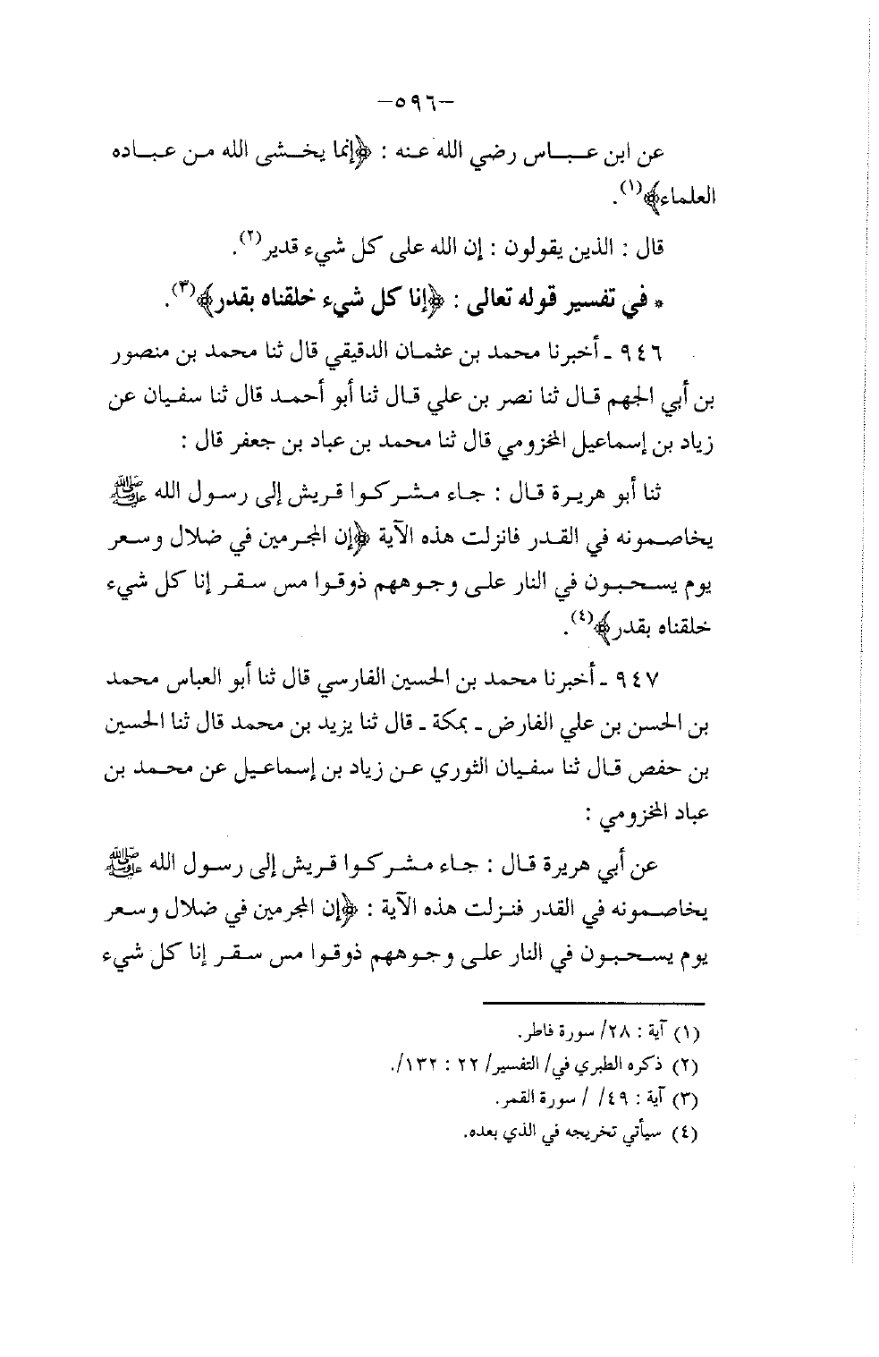 946 - أَخْبَرَنَا مُحَمَّدُ بْنُ عُثْمَانَ الدَّقِيقِيُّ قَالَ: ثنا مُحَمَّدُ بْنُ مَنْصُورِ بْنِ أَبِي الْجَهْمِ قَالَ: ثنا نَصْرُ بْنُ عَلِيٍّ قَالَ: ثنا أَبُو أَحْمَدَ قَالَ: ثنا سُفْيَانُ، عَنْ زِيَادِ بْنِ إِسْمَاعِيلَ الْمَخْزُومِيِّ قَالَ: ثنا مُحَمَّدُ بْنُ عَبَّادِ بْنِ جَعْفَرٍ قَالَ: ثنا أَبُو هُرَيْرَةَ قَالَ§: جَاءَ مُشْرِكُوا قُرَيْشٍ إِلَى رَسُولِ اللَّهِ صَلَّى اللهُ عَلَيْهِ وَسَلَّمَ يُخَاصِمُونَهُ فِي الْقَدَرِ، فَأُنْزِلَتْ هَذِهِ الْآيَةُ: {إِنَّ الْمُجْرِمِينَ فِي ضَلَالٍ وَسُعُرٍ، يَوْمَ يُسْحَبُونَ فِي النَّارِ عَلَى وُجُوهِهِمْ ذُوقُوا مَسَّ سَقَرَ، إِنَّا كُلَّ شَيْءٍ خَلَقْنَاهُ بِقَدَرٍ} [القمر: 48]