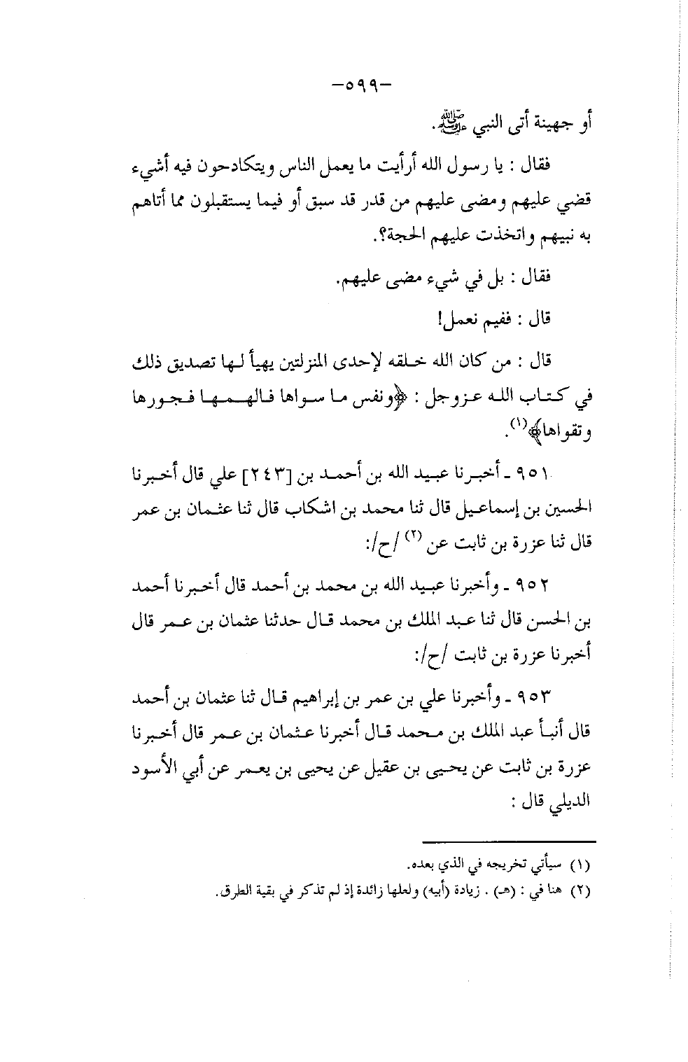953 - وَأَخْبَرَنَا عَلِيُّ بْنُ عُمَرَ بْنِ إِبْرَاهِيمَ قَالَ: ثنا عُثْمَانُ بْنُ أَحْمَدَ قَالَ: أنبأ عَبْدُ الْمَلِكِ بْنُ مُحَمَّدٍ قَالَ: أَخْبَرَنَا عُثْمَانُ بْنُ عُمَرَ قَالَ: أَخْبَرَنَا عَزْرَةُ بْنُ ثَابِتٍ، عَنْ يَحْيَى بْنِ عَقِيلٍ، عَنْ يَحْيَى بْنِ يَعْمَرَ، عَنْ أَبِي الْأَسْوَدِ الدِّيلِيِّ قَالَ -[600]-: قَالَ لِي عِمْرَانُ بْنُ حُصَيْنٍ: أَرَأَيْتَ مَا يَعْمَلُ النَّاسُ الْيَوْمَ وَيَكْدَحُونَ أَشَيْءٌ قُضِيَ عَلَيْهِمْ وَسَبَقَ أَوْ فِيمَا يُسْتَقْبَلُونَ مِمَّا أَتَاهُمْ بِهِ نَبِيُّهُمْ وَثَبَتَتْ بِهِ الْحُجَّةُ؟ قَالَ: قُلْتُ: لَا، بَلْ فِيمَا قُضِيَ عَلَيْهِمْ وَمَضَى قَالَ: أَفَيَكُونُ ذَلِكَ ظُلْمًا؟ قَالَ: فَفَزِعْتُ فَزِعًا شَدِيدًا وَقُلْتُ: إِنَّهُ لَيْسَ خَلْقٌ إِلَّا وَهُوَ لِلَّهِ. زَادَ ابْنُ إِشْكَابٍ: وَمِلْكُ يَدِهِ {لَا يُسْأَلُ عَمَّا يَفْعَلُ وَهُمْ يُسْأَلُونَ} [الأنبياء: 23] فَقَالَ: سَدَّدَكَ اللَّهُ، إِنَّمَا أَرَدْتُ أَنْ أَحْرِزَ عَقْلَكَ. إِنَّ رَجُلًا مِنْ مُزَيْنَةَ أَتَى النَّبِيَّ صَلَّى اللهُ عَلَيْهِ وَسَلَّمَ فَقَالَ: يَا رَسُولَ اللَّهِ §أَرَأَيْتَ مَا يَعْمَلُ النَّاسُ الْيَوْمَ فِيهِ وَمَا يَكْدَحُونَ أَشَيْءٌ قُضِيَ عَلَيْهِمْ وَمَضَى أَوْ فِيمَا يُسْتَقْبَلُونَ مِمَّا أَتَاهُمْ بِهِ نَبِيُّهُمْ صَلَّى اللهُ عَلَيْهِ وَسَلَّمَ؟ فَقَالَ: «فِيمَا قُضِيَ عَلَيْهِمْ وَمَضَى عَلَيْهِمْ» فَقَالَ الرَّجُلُ: فَفِيمَ الْعَمَلُ؟ قَالَ رَسُولُ اللَّهِ صَلَّى اللهُ عَلَيْهِ وَسَلَّمَ: " مَنْ كَانَ خَلَقَهُ اللَّهُ لِإِحْدَى الْمَنْزِلَتَيْنِ فَيَسْتَعْمِلُهُ لَهَا، وَتَصْدِيقُ ذَلِكَ فِي كِتَابِ اللَّهِ عَزَّ وَجَلَّ {فَأَلْهَمَهَا فُجُورَهَا وَتَقْوَاهَا} [الشمس: 8] أَخْرَجَهُ مُسْلِمٌ عَنْ إِسْحَاقَ بْنِ رَاهَوَيْهِ، عَنْ عُثْمَانَ بْنِ عُمَرَ