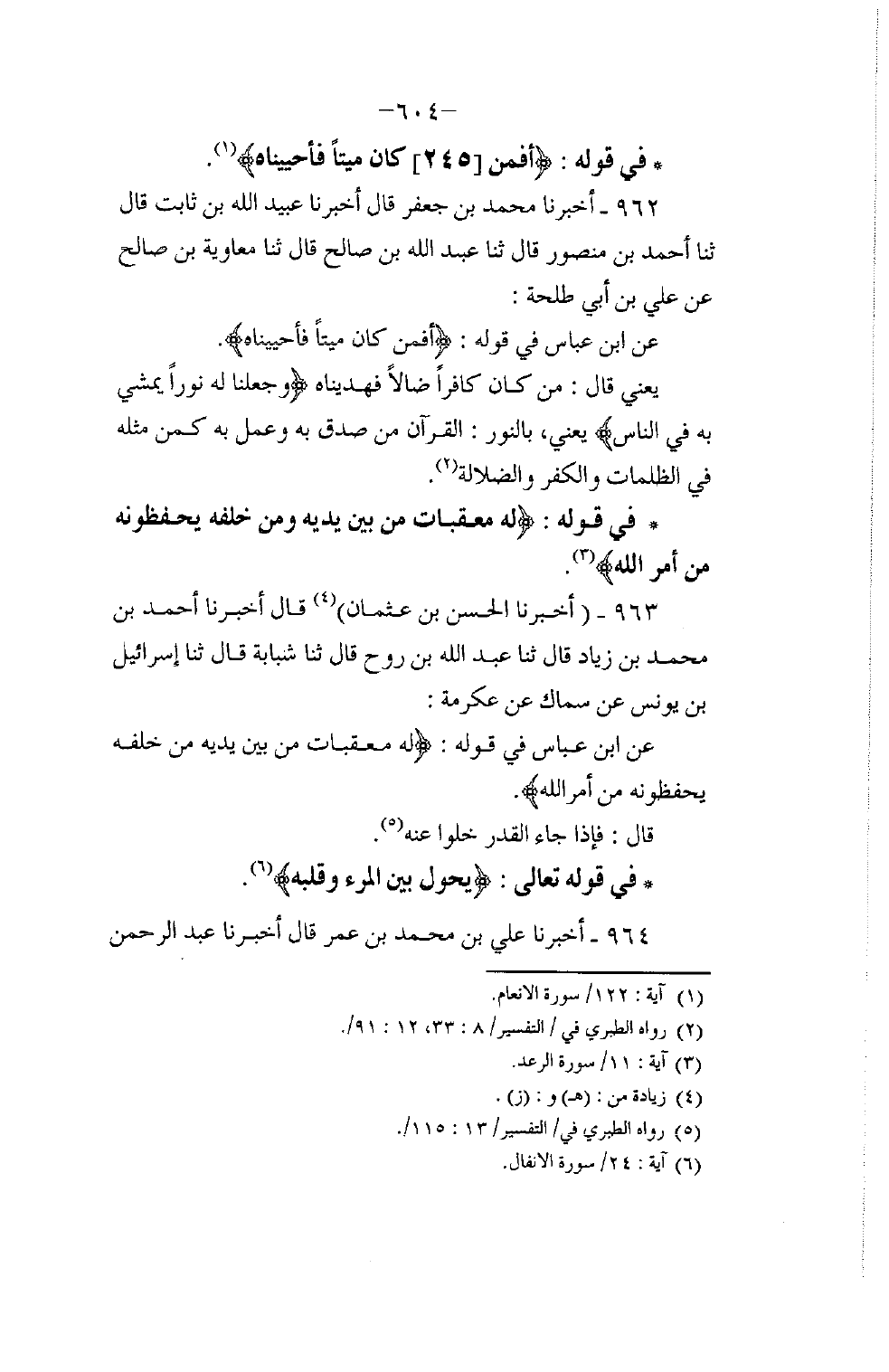 962 - أَخْبَرَنَا مُحَمَّدُ بْنُ جَعْفَرٍ قَالَ: أَخْبَرَنَا عُبَيْدُ اللَّهِ بْنُ ثَابِتٍ قَالَ: ثنا أَحْمَدُ بْنُ مَنْصُورٍ قَالَ: ثنا عَبْدُ اللَّهِ بْنُ صَالِحٍ قَالَ: ثنا مُعَاوِيَةُ بْنُ صَالِحٍ، عَنْ عَلِيِّ بْنِ أَبِي طَلْحَةَ، عَنِ ابْنِ عَبَّاسٍ، فِي قَوْلِهِ: {§أَوَمَنْ كَانَ مَيْتًا فَأَحْيَيْنَاهُ} يَعْنِي قَالَ: مَنْ كَانَ كَافِرًا ضَالًّا فَهَدَيْنَاهُ {وَجَعَلْنَا لَهُ نُورًا يَمْشِي بِهِ فِي النَّاسِ} [الأنعام: 122] يَعْنِي بِالنُّورِ: الْقُرْآنَ مِنْ صَدَّقَ بِهِ وَعَمِلَ بِهِ كَمَنْ مَثَلُهُ فِي الظُّلُمَاتِ وَالْكُفْرِ وَالضَّلَالَةِ