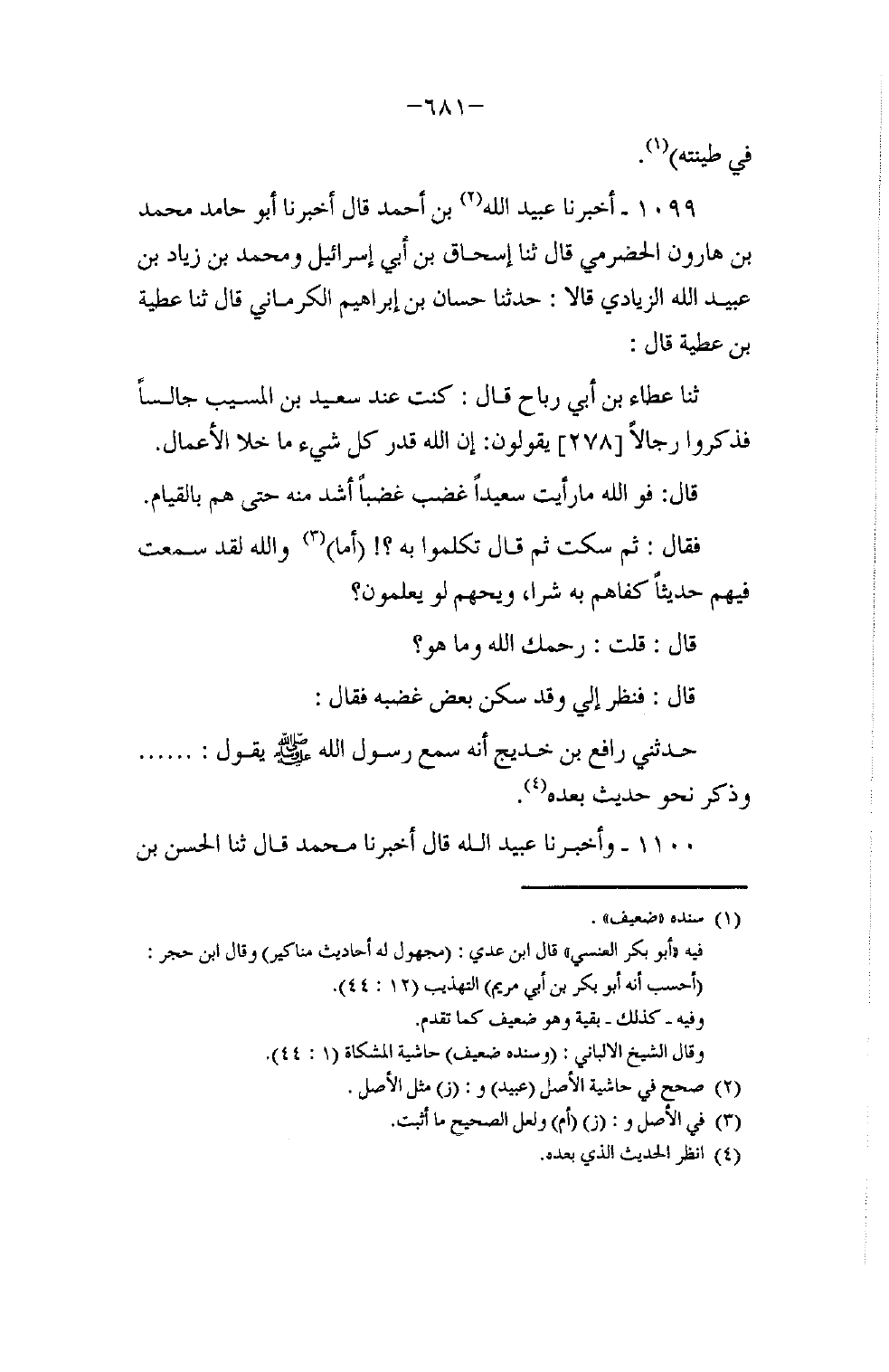 1099 - أَخْبَرَنَا عُبَيْدُ اللَّهِ بْنُ أَحْمَدَ قَالَ: أَخْبَرَنَا أَبُو حَامِدٍ مُحَمَّدُ بْنُ هَارُونَ الْحَضْرَمِيُّ قَالَ: ثنا إِسْحَاقُ بْنُ أَبِي إِسْرَائِيلَ , وَمُحَمَّدُ بْنُ زِيَادِ بْنِ عُبَيْدِ اللَّهِ الزِّيَادِيُّ قَالَا: حَدَّثَنَا حَسَّانُ بْنُ إِبْرَاهِيمَ الْكِرْمَانِيُّ قَالَ: ثنا عَطِيَّةُ بْنُ عَطِيَّةَ قَالَ: ثنا عَطَاءُ بْنُ أَبِي رَبَاحٍ قَالَ: كُنْتُ عِنْدَ سَعِيدِ بْنِ الْمُسَيِّبِ جَالِسًا فَذَكَرُوا رِجَالًا يَقُولُونَ: إِنَّ اللَّهَ قَدَّرَ كُلَّ شَيْءٍ مَا خَلَا الْأَعْمَالَ، قَالَ: فَوَاللَّهِ مَا رَأَيْتُ سَعِيدًا غَضِبَ غَضَبًا أَشَدَّ مِنْهُ حَتَّى هَمَّ بِالْقِيَامِ، فَقَالَ: ثُمَّ سَكَتَ، ثُمَّ قَالَ: تَكَلَّمُوا بِهِ أَمَا وَاللَّهِ لَقَدْ سَمِعْتُ فِيهِمْ حَدِيثًا كَفَاهُمْ بِهِ شَرًّا وَيْحَهُمْ لَوْ يَعْلَمُونَ قَالَ: قُلْتُ: رَحِمَكَ اللَّهُ وَمَا هُوَ؟ قَالَ: فَنَظَرَ إِلَيَّ وَقَدْ سَكَنَ بَعْضُ غَضَبِهِ فَقَالَ: حَدَّثَنِي رَافِعُ بْنُ خُدَيْجٍ أَنَّهُ سَمِعَ رَسُولَ اللَّهِ صَلَّى اللهُ عَلَيْهِ وَسَلَّمَ يَقُولُ، وَذَكَرَ نَحْوَ حَدِيثٍ بَعْدَهُ.