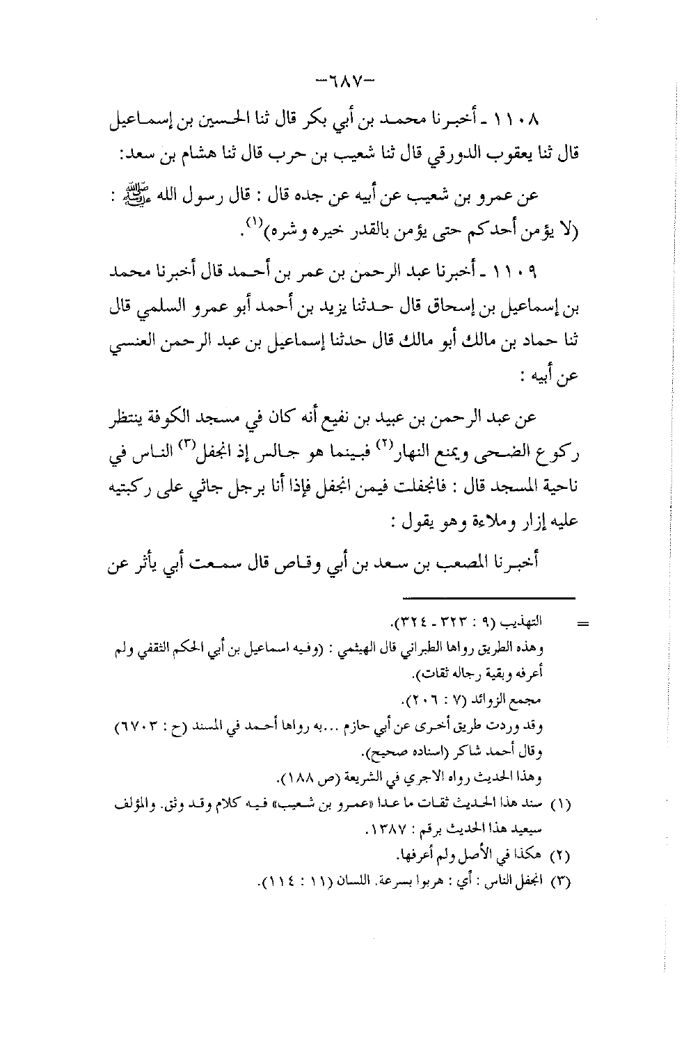 1108 - أَخْبَرَنَا مُحَمَّدُ بْنُ أَبِي بَكْرٍ قَالَ: ثنا الْحُسَيْنُ بْنُ إِسْمَاعِيلَ قَالَ: ثنا يَعْقُوبُ الدَّوْرَقِيُّ قَالَ: ثنا شُعَيْبُ بْنُ حَرْبٍ قَالَ: ثنا هِشَامُ بْنُ سَعْدٍ , عَنْ عَمْرِو بْنِ شُعَيْبٍ , عَنْ أَبِيهِ , عَنْ جَدِّهِ قَالَ: قَالَ رَسُولُ اللَّهِ صَلَّى اللهُ عَلَيْهِ وَسَلَّمَ: «لَا §يُؤْمِنُ أَحَدُكُمْ حَتَّى يُؤْمِنَ بِالْقَدَرِ خَيْرِهِ وَشَرِّهِ»