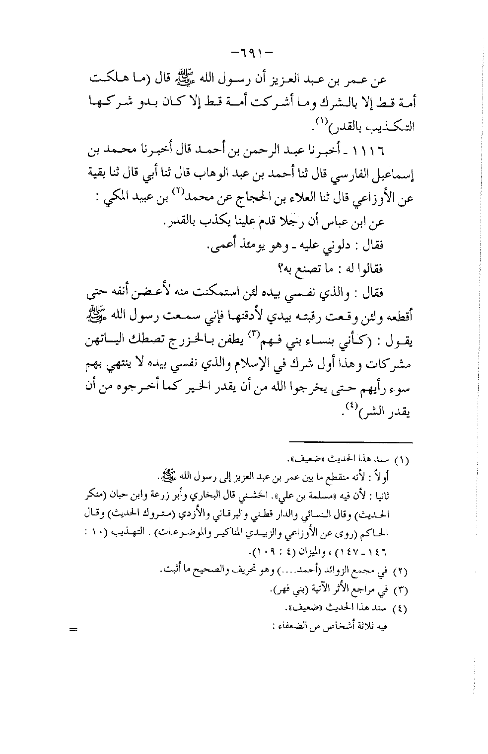 1116 - أَخْبَرَنَا عَبْدُ الرَّحْمَنِ بْنُ أَحْمَدَ قَالَ: أَخْبَرَنَا مُحَمَّدُ بْنُ إِسْمَاعِيلَ الْفَارِسِيُّ قَالَ: ثنا أَحْمَدُ بْنُ عَبْدِ الْوَهَّابِ قَالَ: ثنا أَبِي قَالَ: ثنا بَقِيَّةُ , عَنِ الْأَوْزَاعِيِّ قَالَ: ثنا الْعَلَاءُ بْنُ الْحَجَّاجِ , عَنْ مُحَمَّدِ بْنِ عُبَيْدٍ الْمَكِّيِّ , عَنِ ابْنِ عَبَّاسٍ أَنَّ رَجُلًا قَدِمَ عَلَيْنَا يُكَذِّبُ بِالْقَدَرِ فَقَالَ: دُلُّونِي عَلَيْهِ وَهُوَ يَوْمَئِذٍ أَعْمَى، فَقَالُوا لَهُ: مَا تَصْنَعُ بِهِ؟ فَقَالَ: وَالَّذِي نَفْسِي بِيَدِهِ لَئِنِ اسْتَمْكَنْتُ مِنْهُ لَأَعُضَّنَّ أَنْفَهُ حَتَّى أَقْطَعَهُ، وَلَئِنْ وَقَعَتْ رَقَبَتُهُ بِيَدِي لَأَدُقَّنَّهَا، فَإِنِّي سَمِعْتُ رَسُولَ اللَّهِ صَلَّى اللهُ عَلَيْهِ وَسَلَّمَ يَقُولُ: «كَأَنِّي §بِنِسَاءِ بَنِي فَهْمٍ يَطُفْنَ بِالْخَزْرَجِ تَصْطَكُّ أَلْيَاتُهُنَّ مُشْرِكَاتٍ، وَهَذَا أَوَّلُ شِرْكٍ فِي الْإِسْلَامِ، وَالَّذِي نَفْسِي بِيَدِهِ لَا يَنْتَهِي بِهِمْ سُوءُ رَأْيِهِمْ حَتَّى يُخْرِجُوا اللَّهَ مِنْ أَنْ يُقَدِّرَ الْخَيْرَ كَمَا أَخْرِجُوهُ مِنْ أَنْ يَقَدِّرَ الشَّرَّ»