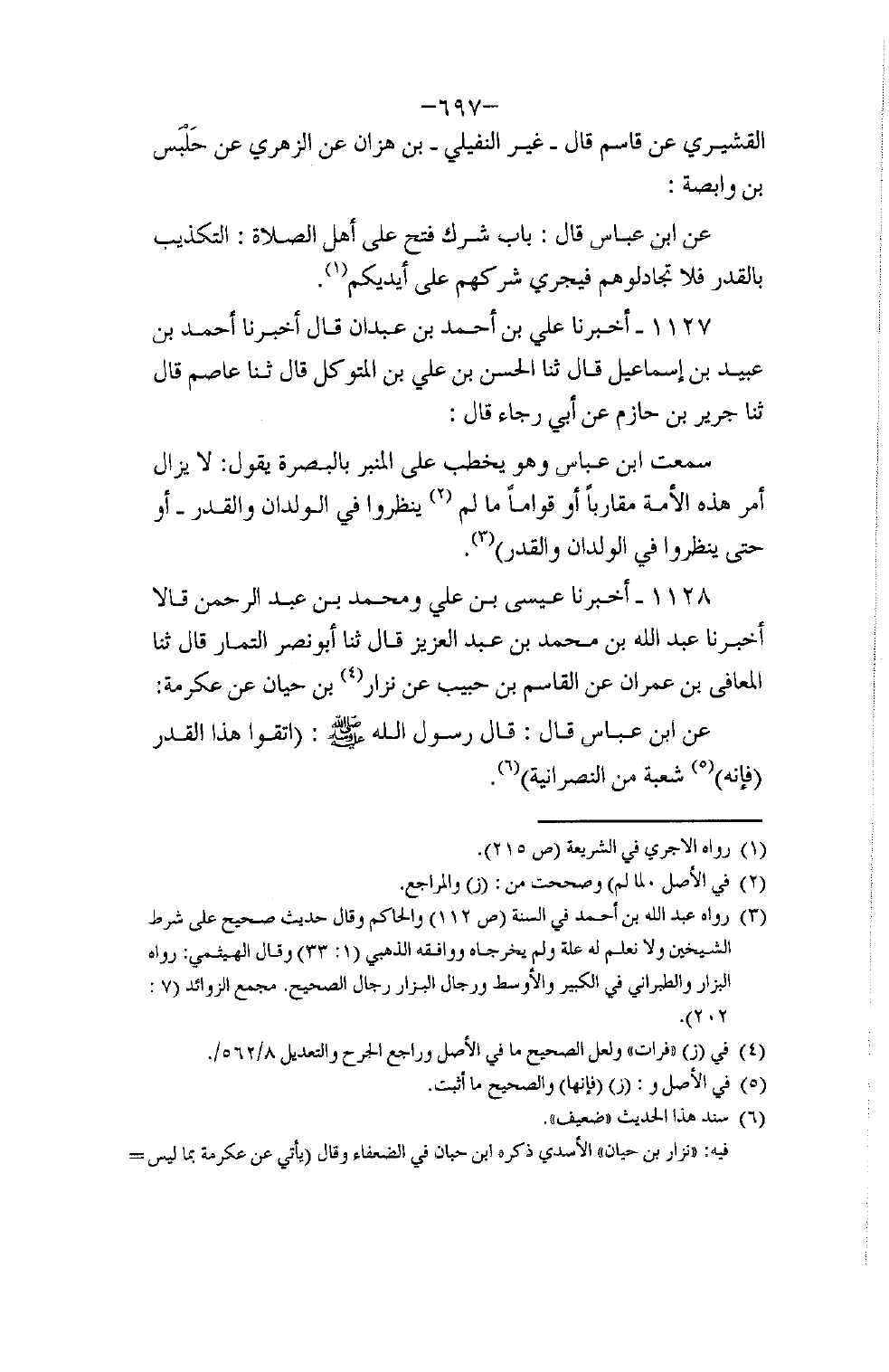 1128 - أَخْبَرَنَا عِيسَى بْنُ عَلِيِّ بْنِ مُحَمَّدِ بْنِ عَبْدِ الرَّحْمَنِ قَالَ: أَخْبَرَنَا عَبْدُ اللَّهِ بْنُ مُحَمَّدِ بْنِ عَبْدِ الْعَزِيزِ قَالَ: ثنا أَبُو نَصْرٍ التَّمَّارُ قَالَ: ثنا الْمُعَافَى بْنُ عِمْرَانَ , عَنِ الْقَاسِمِ بْنِ حَبِيبٍ , عَنْ نِزَارِ بْنِ حَيَّانَ , عَنْ عِكْرِمَةَ , عَنِ ابْنِ عَبَّاسٍ قَالَ: قَالَ رَسُولُ اللَّهِ صَلَّى اللهُ عَلَيْهِ وَسَلَّمَ: §«اتَّقُوا هَذَا الْقَدَرَ فَإِنَّهُ شُعْبَةٌ مِنَ النَّصْرَانِيَّةِ» -[698]- وَقَالَ ابْنُ عَبَّاسٍ: اتَّقُوا هَذَا الْإِرْجَاءَ فَإِنَّهُ شُعْبَةٌ مِنَ النَّصْرَانِيَّةِ