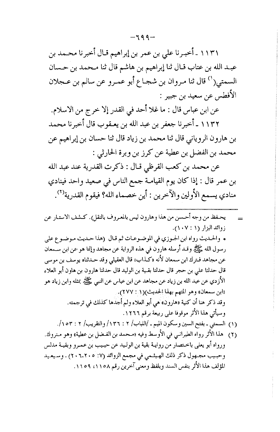 1131 - أَخْبَرَنَا عَلِيُّ بْنُ عُمَرَ بْنِ إِبْرَاهِيمَ قَالَ: أَخْبَرَنَا مُحَمَّدُ بْنُ عَبْدِ اللَّهِ بْنِ عَتَّابٍ قَالَ: ثنا إِبْرَاهِيمُ بْنُ هَاشِمٍ قَالَ: ثنا مُحَمَّدُ بْنُ حَسَّانَ السَّمْتِيُّ قَالَ: ثنا مَرْوَانُ بْنُ شُجَاعٍ أَبُو عَمْرٍو , عَنْ سَالِمِ بْنِ عَجْلَانَ الْأَفْطَسِ , عَنْ سَعِيدِ بْنِ جُبَيْرٍ , عَنِ ابْنِ عَبَّاسٍ قَالَ: مَا غَلَا أَحَدٌ فِي §الْقَدَرِ إِلَّا خَرَجَ مِنَ الْإِسْلَامِ