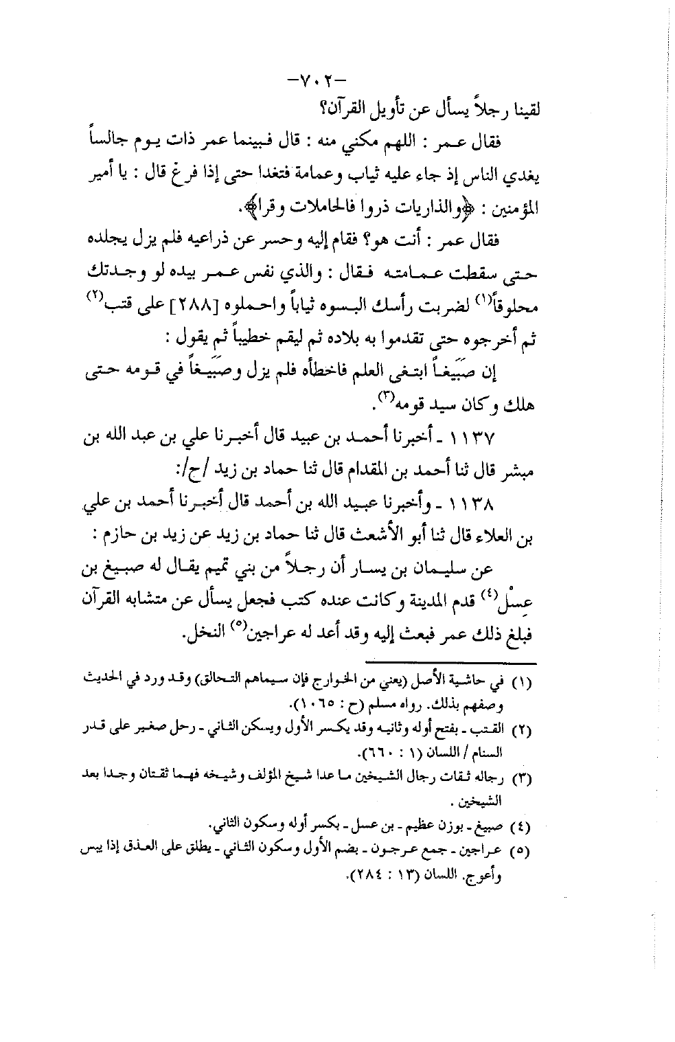 1138 - وَأَخْبَرَنَا عَبْدُ اللَّهِ بْنُ أَحْمَدَ قَالَ: أَخْبَرَنَا أَحْمَدُ بْنُ عَلِيِّ بْنِ الْعَلَاءِ قَالَ: ثنا أَبُو الْأَشْعَثِ قَالَ: ثنا حَمَّادُ بْنُ زَيْدٍ , عَنْ زَيْدِ بْنِ حَازِمٍ , عَنْ سُلَيْمَانَ بْنِ يَسَارٍ أَنَّ رَجُلًا مِنْ بَنِي غُنَيْمٍ يُقَالُ لَهُ: صَبِيغُ بْنُ عِسْلٍ قَدِمَ الْمَدِينَةَ وَكَانَتْ عِنْدَهُ كُتُبٌ، فَجَعَلَ يَسْأَلُهُ عَنْ مُتَشَابَهِ الْقُرْآنِ، فَبَلَغَ ذَلِكَ عُمَرَ، فَبَعَثَ إِلَيْهِ وَقَدْ أَعَدَّ لَهُ عَرَاجِينَ النَّخِيلِ -[703]-، فَلَمَّا دَخَلَ عَلَيْهِ جَلَسَ قَالَ: مِنْ أَنْتَ؟ قَالَ: أَنَا عَبْدُ اللَّهِ صَبِيغُ، قَالَ عُمَرُ: وَأَنَا عَبْدُ اللَّهِ عُمَرُ وَأَوْمَأَ عَلَيْهِ فَجَعَلَ يَضْرِبُهُ بِتِلْكَ الْعَرَاجِينِ فَمَا زَالَ يَضْرِبُهُ حَتَّى شَجَّهُ وَجَعَلَ الدَّمَ يَسِيلُ عَنْ وَجْهِهِ، فَقَالَ: §حَسْبُكَ يَا أَمِيرَ الْمُؤْمِنِينَ فَقَدْ وَاللَّهِ ذَهَبَ الَّذِي أَجِدُ فِي رَأْسِي وَاللَّفْظُ لِحَدِيثِ ابْنِ مُبَشِّرٍ