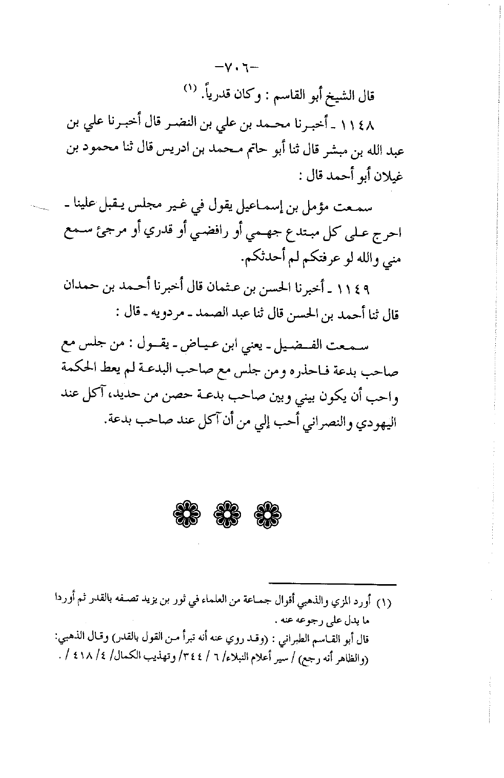 1148 - أَخْبَرَنَا مُحَمَّدُ بْنُ عَلِيِّ بْنِ النَّضْرِ قَالَ: أَخْبَرَنَا عَلِيُّ بْنُ عَبْدِ اللَّهِ بْنِ مُبَشِّرٍ قَالَ: ثنا أَبُو حَاتِمٍ مُحَمَّدُ بْنُ إِدْرِيسَ قَالَ: ثنا مَحْمُودُ بْنُ غَيْلَانَ أَبُو أَحْمَدَ قَالَ: سَمِعْتُ مُؤَمَّلَ بْنَ إِسْمَاعِيلَ يَقُولُ فِي غَيْرِ مَجْلِسٍ: يُقْبِلُ عَلَيْنَا، أُحَرِّجُ عَلَى كُلِّ §مُبْتَدَعٍ جَهْمِيٍّ، أَوْ رَافِضِيٍّ، أَوْ قَدَرِيٍّ، أَوْ مُرْجِئٍ سَمِعَ مِنِّيَ، وَاللَّهِ لَوْ عَرَفْتُكُمْ لَمْ أُحَدِّثْكُمْ