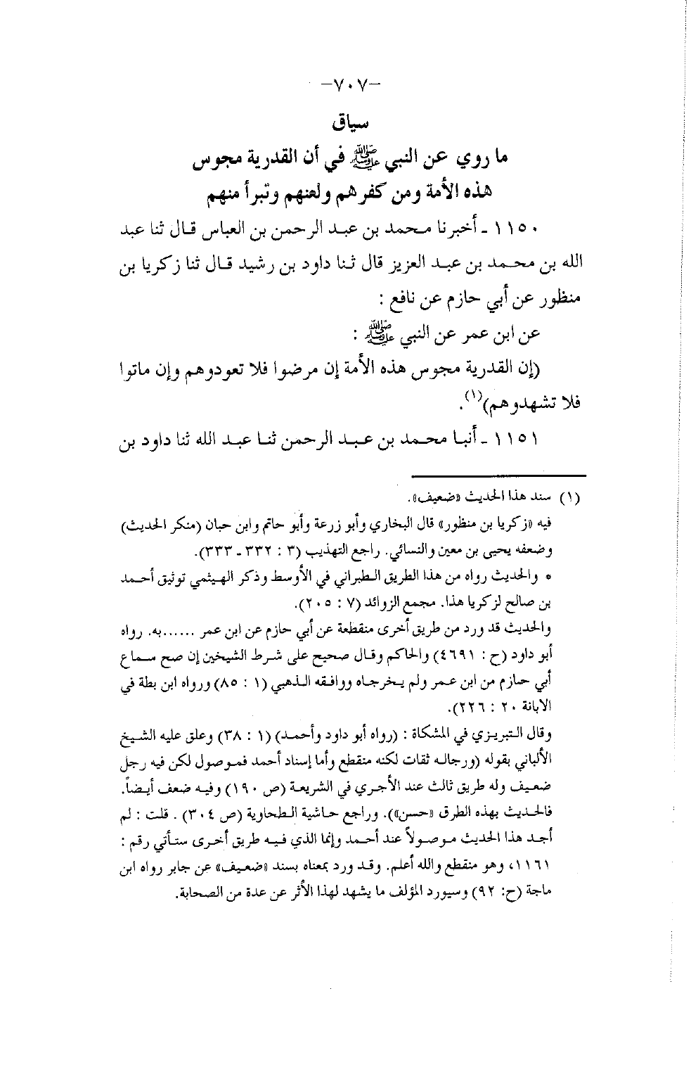 1150 - أَخْبَرَنَا مُحَمَّدُ بْنُ عَبْدِ الرَّحْمَنِ بْنِ الْعَبَّاسِ قَالَ: ثنا عَبْدُ اللَّهِ بْنُ مُحَمَّدِ بْنِ عَبْدِ الْعَزِيزِ قَالَ: ثنا دَاوُدُ بْنُ رُشَيْدٍ قَالَ: ثنا زَكَرِيَّا بْنُ مَنْظُورٍ , عَنْ أَبِي حَازِمٍ , عَنْ نَافِعٍ , عَنِ ابْنِ عُمَرَ , عَنِ النَّبِيِّ صَلَّى اللهُ عَلَيْهِ وَسَلَّمَ: «إِنَّ §الْقَدَرِيَّةَ مَجُوسُ هَذِهِ الْأُمَّةِ، إِنْ مَرِضُوا فَلَا تَعُودُوهُمْ، وَإِنْ مَاتُوا فَلَا تَشْهَدُوهُمْ»