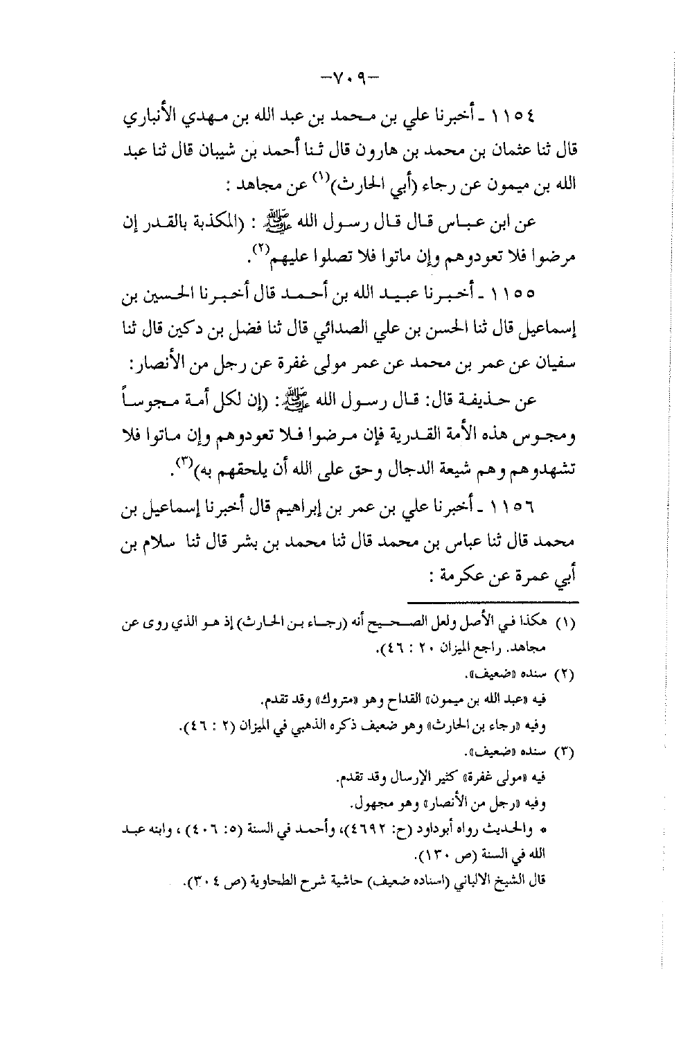 1154 - أَخْبَرَنَا عَلِيُّ بْنُ مُحَمَّدِ بْنِ عَبْدِ اللَّهِ بْنِ مَهْدِيٍّ الْأَنْبَارِيُّ قَالَ: ثنا عُثْمَانُ بْنُ مُحَمَّدِ بْنِ هَارُونَ قَالَ: ثنا أَحْمَدُ بْنُ شَيْبَانَ قَالَ: ثنا عَبْدُ اللَّهِ بْنُ مَيْمُونٍ , عَنْ رَجَاءٍ أَبِي الْحَارِثِ , عَنْ مُجَاهِدٍ , عَنِ ابْنِ عَبَّاسٍ قَالَ: قَالَ رَسُولُ اللَّهِ صَلَّى اللهُ عَلَيْهِ وَسَلَّمَ: «§الْمُكَذِّبَةُ بِالْقَدَرِ إِنْ مَرِضُوا فَلَا تَعُودُوهُمْ، وَإِنْ مَاتُوا فَلَا تُصَلُّوا عَلَيْهِمْ»