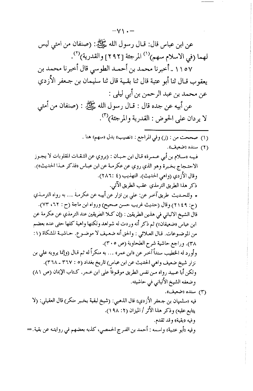 1157 - أَخْبَرَنَا مُحَمَّدُ بْنُ أَحْمَدَ الطُّوسِيُّ قَالَ: أَخْبَرَنَا مُحَمَّدُ بْنُ يَعْقُوبَ قَالَ: ثنا أَبُو عُتْبَةَ قَالَ: نا بَقِيَّةُ قَالَ: ثنا سُلَيْمَانُ بْنُ جَعْفَرٍ الْأَزْدِيُّ , عَنْ مُحَمَّدِ بْنِ عَبْدِ الرَّحْمَنِ بْنِ أَبِي لَيْلَى , عَنْ أَبِيهِ , عَنْ جَدِّهِ قَالَ: قَالَ رَسُولُ اللَّهِ صَلَّى اللهُ عَلَيْهِ وَسَلَّمَ: §«صِنْفَانِ مِنْ أُمَّتِي لَا يَرِدَانِ عَلَى الْحَوْضِ الْقَدَرِيَّةُ وَالْمُرْجِئَةُ»