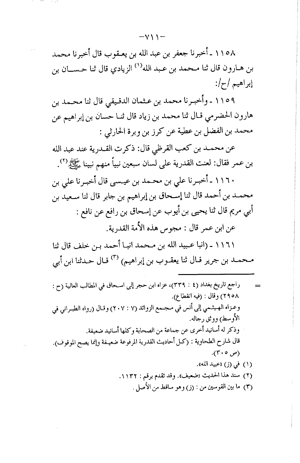 1161 - أَخْبَرَنَا عَلِيُّ بْنُ مُحَمَّدِ بْنِ عِيسَى قَالَ: أَخْبَرَنَا عَلِيُّ بْنُ مُحَمَّدِ بْنِ أَحْمَدَ قَالَ: ثنا إِسْحَاقُ بْنُ إِبْرَاهِيمَ بْنِ جَابِرٍ قَالَ: ثنا سَعِيدُ بْنُ أَبِي مَرْيَمَ قَالَ: ثنا يَحْيَى بْنُ أَيُّوبَ , عَنْ إِسْحَاقَ بْنِ رَافِعٍ , عَنْ نَافِعٍ , عَنِ ابْنِ عُمَرَ قَالَ: §مَجُوسُ هَذِهِ الْأُمَّةِ الْقَدَرِيَّةُ