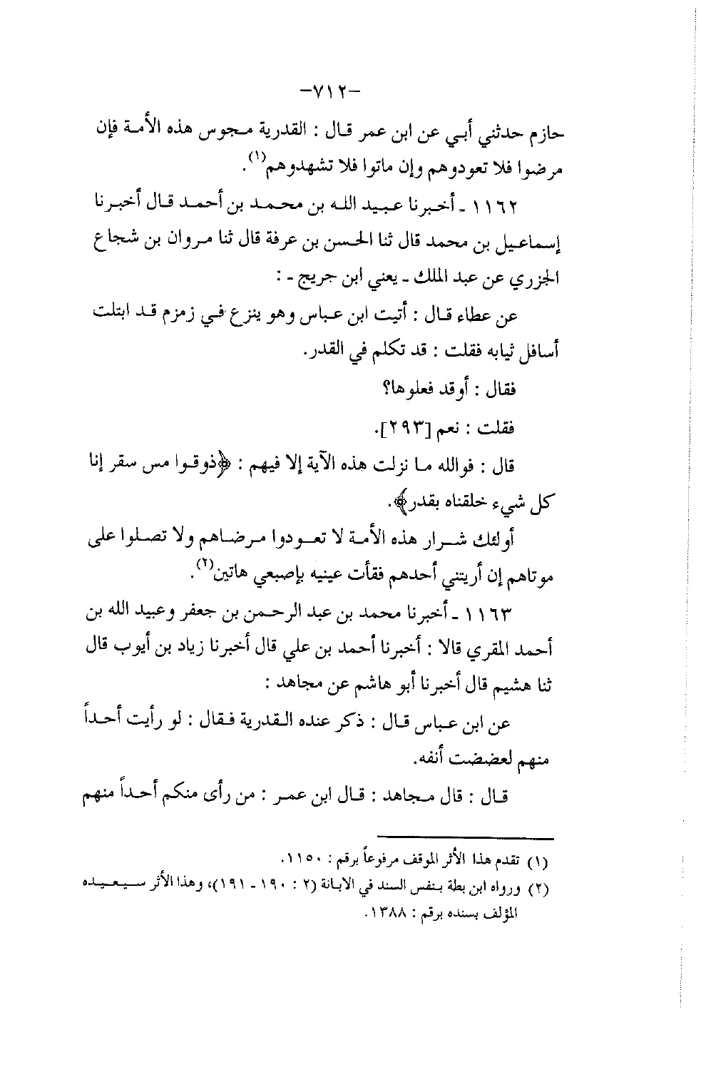 1162 - أَخْبَرَنَا عُبَيْدُ اللَّهِ بْنُ مُحَمَّدِ بْنِ أَحْمَدَ قَالَ: أَخْبَرَنَا إِسْمَاعِيلُ بْنُ مُحَمَّدٍ قَالَ: ثنا الْحَسَنُ بْنُ عَرَفَةَ قَالَ: ثنا مَرْوَانُ بْنُ شُجَاعٍ الْجَزَرِيُّ , عَنْ عَبْدِ الْمَلِكِ يَعْنِي ابْنَ جُرَيْجٍ , عَنْ عَطَاءٍ قَالَ: أَتَيْتُ ابْنَ عَبَّاسٍ وَهُوَ يَنْزِعُ فِي زَمْزَمَ، قَدِ ابْتَلَّتْ أَسَافِلُ ثِيَابِهِ، فَقُلْتُ: قَدْ تُكُلِّمَ فِي الْقَدَرِ، فَقَالَ: أَوَقَدْ فَعَلُوهَا؟ فَقُلْتُ: نَعَمْ، قَالَ: فَوَاللَّهِ مَا نَزَلَتْ هَذِهِ الْآيَةُ إِلَّا فِيهِمْ {§ذُوقُوا مَسَّ سَقَرَ إِنَّا كُلَّ شَيْءٍ خَلَقْنَاهُ بِقَدَرٍ} [القمر: 49] أُولَئِكَ شِرَارُ هَذِهِ الْأُمَّةِ، لَا تَعُودُوا مَرْضَاهُمْ، وَلَا تُصَلُّوا عَلَى مَوْتَاهُمْ، إِنْ أَرَيْتَنِي أَحَدَهُمْ فَقَأْتُ عَيْنَيْهِ بِإِصْبَعَيَّ هَاتَيْنِ