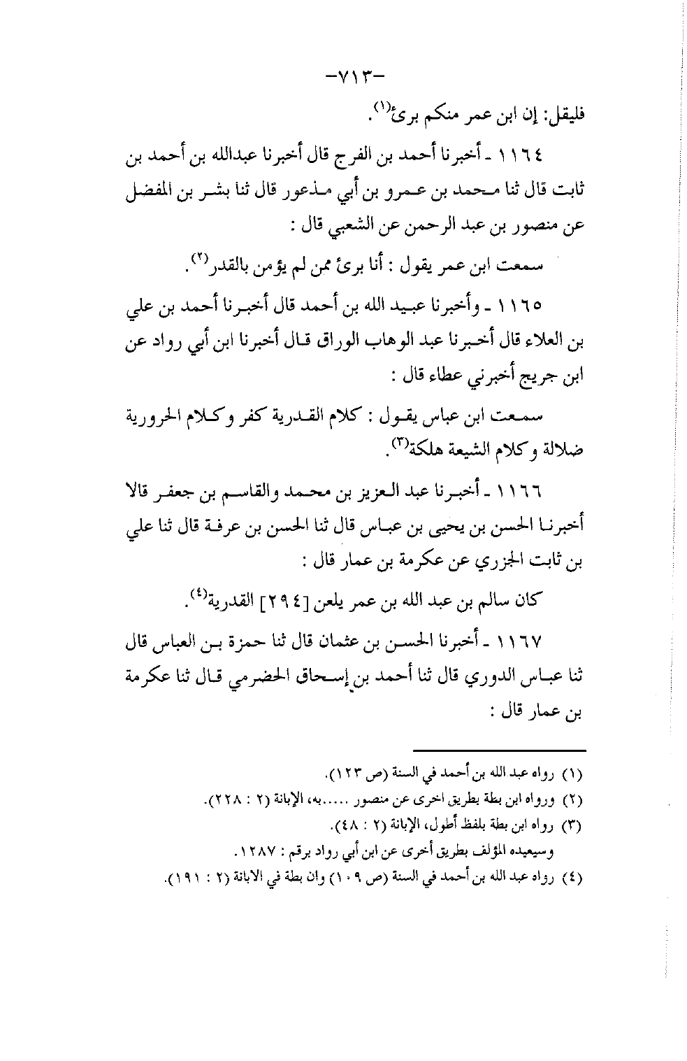 1166 - أَخْبَرَنَا عَبْدُ الْعَزِيزِ بْنُ مُحَمَّدٍ , وَالْقَاسِمُ بْنُ جَعْفَرٍ قَالَا: أَخْبَرَنَا الْحَسَنُ بْنُ يَحْيَى بْنِ عَبَّاسٍ قَالَ: ثنا الْحَسَنُ بْنُ عَرَفَةَ قَالَ: ثنا عَلِيُّ بْنُ ثَابِتٍ الْجَزَرِيُّ , عَنْ عِكْرِمَةَ بْنِ عَمَّارٍ قَالَ: §كَانَ سَالِمُ بْنُ عَبْدِ اللَّهِ بْنِ عُمَرَ يَلْعَنُ الْقَدَرِيَّةَ