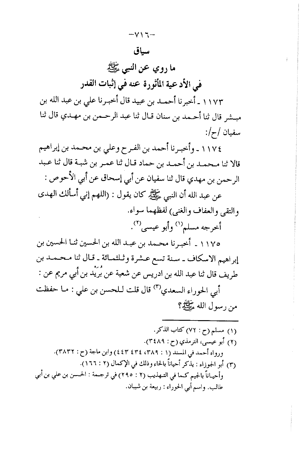 1174 - وَأَخْبَرَنَا أَحْمَدُ بْنُ الْفَرَحِ، وَعَلِيُّ بْنُ مُحَمَّدِ بْنِ إِبْرَاهِيمَ قَالَا: ثنا مُحَمَّدُ بْنُ أَحْمَدَ بْنِ حَمَّادٍ قَالَ: ثنا عُمَرُ بْنُ شَبَّةَ قَالَ: ثنا عَبْدُ الرَّحْمَنِ بْنُ مَهْدِيٍّ قَالَ: ثنا سُفْيَانُ , عَنْ أَبِي إِسْحَاقَ , عَنْ أَبِي الْأَحْوَصِ , عَنْ عَبْدِ اللَّهِ أَنَّ النَّبِيَّ صَلَّى اللهُ عَلَيْهِ وَسَلَّمَ كَانَ يَقُولُ: «اللَّهُمَّ إِنِّي §أَسْأَلُكُ الْهُدَى وَالتُّقَى وَالْعَفَافَ وَالْغِنَى» لَفْظُهُمَا سَوَاءٌ. أَخْرَجَهُ مُسْلِمٌ، وَأَبُو عِيسَى