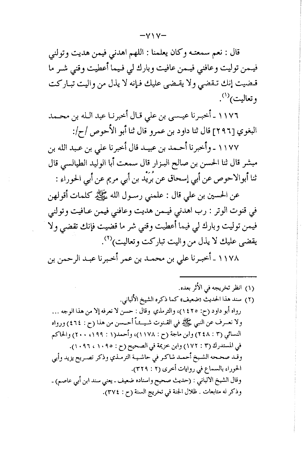 1177 - وَأَخْبَرَنَا أَحْمَدُ بْنُ عُبَيْدٍ قَالَ: أَخْبَرَنَا عَلِيُّ بْنُ عَبْدِ اللَّهِ بْنِ مُبَشِّرٍ قَالَ: ثنا الْحَسَنُ بْنُ صَالِحٍ الْبَزَّارُ قَالَ: سَمِعْتُ أَبَا الْوَلِيدِ الطَّيَالِسِيَّ قَالَ: ثنا أَبُو الْأَحْوَصِ , عَنْ أَبِي إِسْحَاقَ , عَنْ بُرَيْدِ بْنِ أَبِي مَرْيَمَ , عَنْ أَبِي الْحَوْرَاءِ , عَنِ الْحَسَنِ بْنِ عَلِيٍّ قَالَ: عَلَّمَنِي رَسُولُ اللَّهِ صَلَّى اللهُ عَلَيْهِ وَسَلَّمَ كَلِمَاتٍ أَقُولُهُنَّ فِي قُنُوتِ الْوِتْرِ: «رَبِّ اهْدِنِي فِيمَنْ هَدَيْتَ، وَعَافِنِي فِيمَنْ عَافَيْتَ، وَتَوَلَّنِي فِيمَنْ تَوَلَّيْتَ، وَبَارِكْ لِي فِيمَا أَعْطَيْتَ، §وَقِنِي شَرَّ مَا قَضَيْتَ، فَإِنَّكَ تَقْضِي وَلَا يُقْضَى عَلَيْكَ، لَا يَذِلُّ مِنْ وَالَيتَ تَبَارَكْتَ وَتَعَالَيتَ»