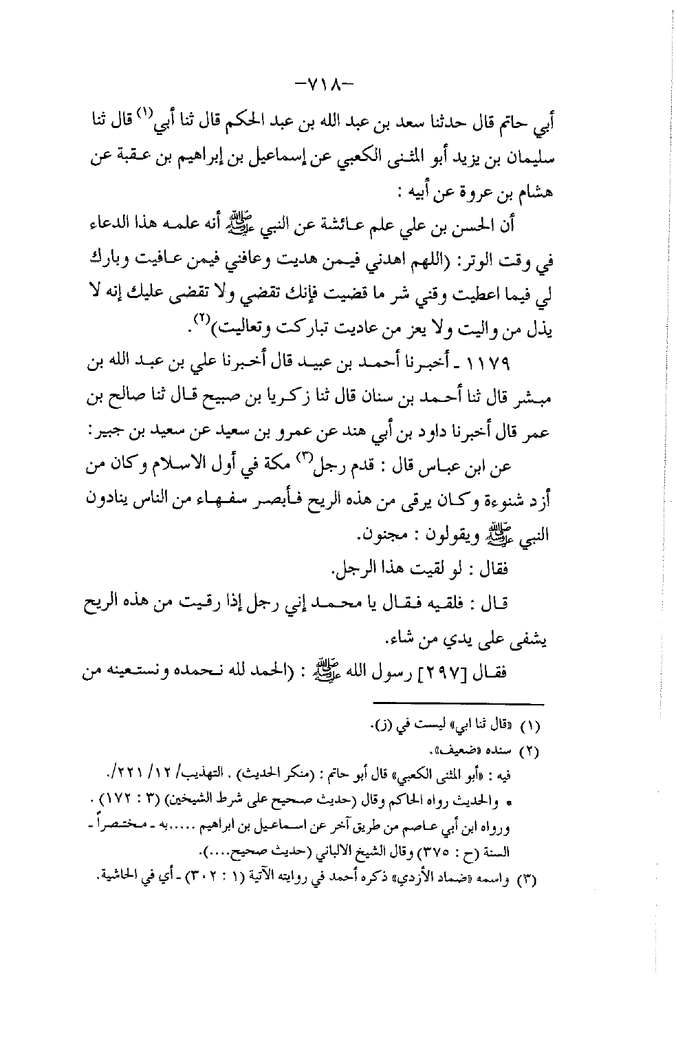 1179 - أَخْبَرَنَا أَحْمَدُ بْنُ عُبَيْدٍ قَالَ: أَخْبَرَنَا عَلِيُّ بْنُ عَبْدِ اللَّهِ بْنِ مُبَشِّرٍ قَالَ: ثنا أَحْمَدُ بْنُ سِنَانٍ قَالَ: نا زَكَرِيَّا بْنُ صُبَيْحٍ قَالَ: ثنا صَالِحُ بْنُ عُمَرَ قَالَ: أَخْبَرَنَا دَاوُدُ بْنُ أَبِي هِنْدَ , عَنْ عَمْرِو بْنِ سَعِيدٍ , عَنْ سَعِيدِ بْنِ جُبَيْرٍ , عَنِ ابْنِ عَبَّاسٍ قَالَ: قَدِمَ رَجُلٌ مَكَّةَ فِي أَوَّلِ الْإِسْلَامِ، وَكَانَ مِنْ أَزِدِ شَنُوءَةَ، وَكَانَ يَرْقِي مِنْ هَذِهِ الرِّيحِ، فَأَبْصَرَ سُفَهَاءَ مِنَ النَّاسِ يُنَادُونَ النَّبِيَّ صَلَّى اللهُ عَلَيْهِ وَسَلَّمَ، وَيَقُولُونَ: مَجْنُونٌ فَقَالَ: لَوْ لَقِيتُ هَذَا الرَّجُلَ، قَالَ: فَلَقِيَهُ، فَقَالَ: يَا مُحَمَّدُ إِنِّي رَجُلٌ إِذَا رَقِيتُ مِنْ هَذِهِ الرِّيحِ يُشْفَى عَلَى يَدَيَّ مِنْ شَاءَ، فَقَالَ رَسُولُ اللَّهِ صَلَّى اللهُ عَلَيْهِ وَسَلَّمَ: «§الْحَمْدُ لِلَّهِ نَحْمَدُهُ وَنَسْتَعِينُهُ، مِنْ -[719]- يَهْدِهِ اللَّهُ فَلَا مُضِلَّ لَهُ، وَمَنْ يُضْلِلْ فَلَا هَادِيَ لَهُ، وَأَشْهَدُ أَنْ لَا إِلَهَ إِلَّا اللَّهُ وَحْدَهُ لَا شَرِيكَ لَهُ، وَأَنَّ مُحَمَّدًا عَبْدُهُ وَرَسُولُهُ، أَمَّا بَعْدُ» فَقَالَ: أَعِدْ عَلَيَّ هَؤُلَاءِ الْكَلِمَاتِ، فَأَعَادَهُنَّ، قَالَ: لَقَدْ سَمِعْتُ قَوْلَ السَّحَرَةِ وَقَوْلَ الْكَهَنَةِ وَقَوْلَ الشُّعَرَاءِ، مَا سَمِعْتُ بِمِثْلِ كَلِمَاتِكَ هَؤُلَاءِ، وَلَقَدْ بَلَغَتْ قَامُوسَ الْبَحْرِ، أَرِنِي يَدَكَ أُبَايِعْكَ عَلَى الْإِسْلَامِ، قَالَ: «وَعَلَى قَوْمِكَ» قَالَ: وَعَلَى قَوْمِي. أَخْرَجَهُ مُسْلِمٌ