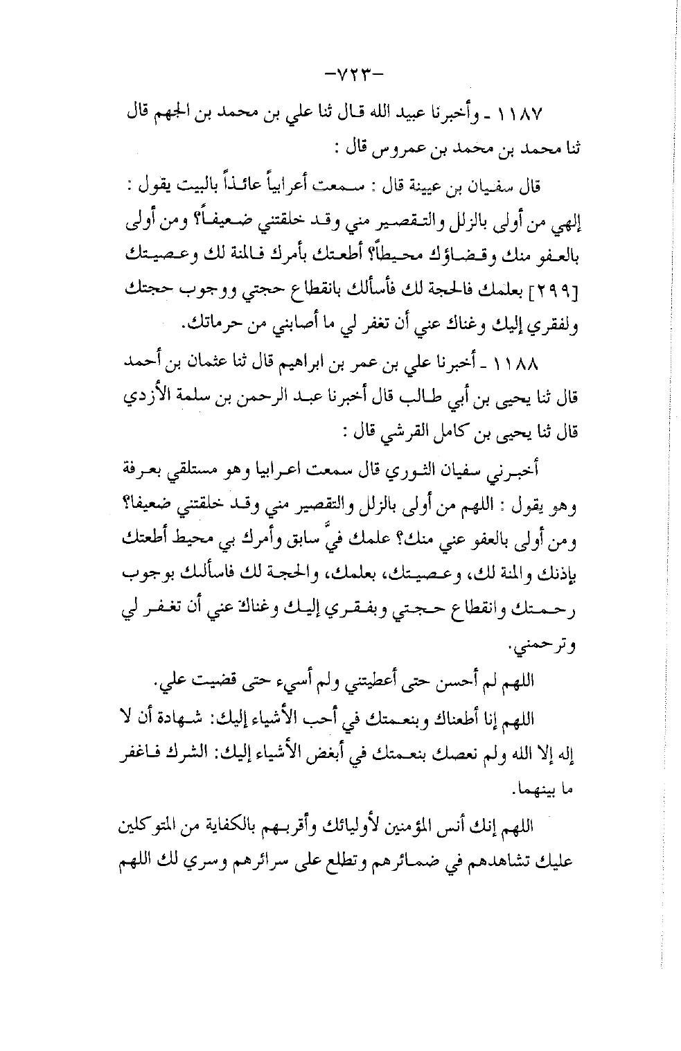 1187 - وَأَخْبَرَنَا عُبَيْدُ اللَّهِ قَالَ: ثنا عَلِيُّ بْنُ مُحَمَّدِ بْنِ الْجَهْمِ قَالَ: ثنا مُحَمَّدُ بْنُ مُحَمَّدِ بْنِ عَمْرُوسٍ قَالَ: قَالَ سُفْيَانُ بْنُ عُيَيْنَةَ: قَالَ سَمِعْتُ أَعْرَابِيًّا عَائِذًا بِالْبَيْتِ يَقُولُ: إِلَهِي §مَنْ أَوْلَى بِالزَّلَلِ وَالتَّقْصِيرِ مِنِّي وَقَدْ خَلَقْتَنِي ضَعِيفًا، وَمَنْ أَوْلَى بِالْعَفْوِ مِنْكَ وَقَضَاؤُكَ مُحِيطٌ، أَطَعْتُكَ بِأَمْرِكَ فَالْمِنَّةُ لَكَ، وَعَصَيْتُكَ بِعِلْمِكَ فَالْحُجَّةُ لَكَ، فَأَسْأَلُكَ بِانْقِطَاعِ حُجَّتِي وَوُجُوبِ حُجَّتِكَ، وَلِفَقْرِي إِلَيْكَ وَغِنَاكَ عَنِّي أَنْ تَغْفِرَ لِي مَا أَصَابَنِي مِنْ حُرُمَاتِكَ