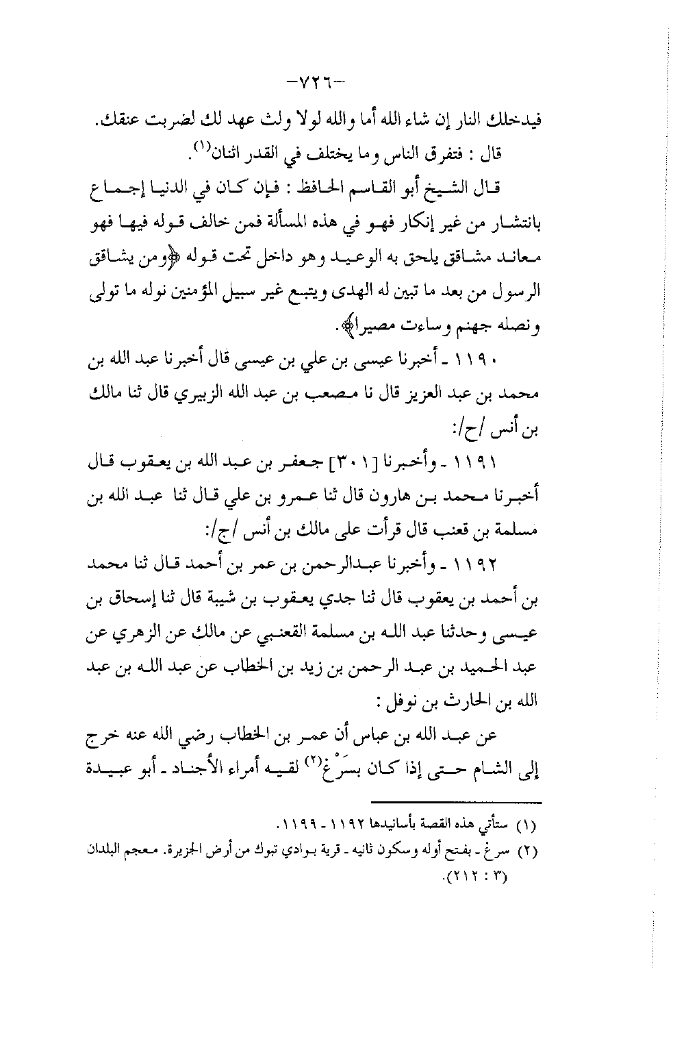 1191 - وَأَخْبَرَنَا جَعْفَرُ بْنُ عَبْدِ اللَّهِ بْنِ يَعْقُوبَ، قَالَ: أَخْبَرَنَا مُحَمَّدُ بْنُ هَارُونَ، قَالَ: ثنا عَمْرُو بْنُ عَلِيٍّ، قَالَ: ثنا عَبْدُ اللَّهِ بْنُ مَسْلَمَةَ بْنِ قَعْنَبٍ، قَالَ: قَرَأْتُ عَلَى مَالِكِ بْنِ أَنَسٍ ح وَأَخْبَرَنَا عَبْدُ الرَّحْمَنِ بْنُ عُمَرَ بْنِ أَحْمَدَ، قَالَ: ثنا مُحَمَّدُ بْنُ أَحْمَدَ بْنِ يَعْقُوبَ، قَالَ: ثنا جَدِّي يَعْقُوبُ بْنُ شَيْبَةَ قَالَ: ثنا إِسْحَاقُ بْنُ عِيسَى , وَحَدَّثَنَا عَبْدُ اللَّهِ بْنُ مَسْلَمَةَ الْقَعْنَبِيُّ , عَنْ مَالِكٍ , عَنِ الزُّهْرِيِّ , عَنْ عَبْدِ الْحَمِيدِ بْنِ عَبْدِ الرَّحْمَنِ بْنِ زَيْدِ بْنِ الْخَطَّابِ , عَنْ عَبْدِ اللَّهِ بْنِ عَبْدِ اللَّهِ بْنِ الْحَارِثِ بْنِ نَوْفَلٍ , عَنْ عَبْدِ اللَّهِ بْنِ عَبَّاسٍ أَنَّ عُمَرَ بْنَ الْخَطَّابِ رَضِيَ اللَّهُ عَنْهُ خَرَجَ إِلَى الشَّامِ حَتَّى إِذَا كَانَ بِسَرْغَ لَقِيَهُ أُمَرَاءُ الْأَجْنَادِ أَبُو عُبَيْدَةَ -[727]- وَأَصْحَابُهُ، فَأَخْبَرُوهُ أَنَّ الْوَبَاءَ وَقَعَ بِالشَّامِ , قَالَ ابْنُ عَبَّاسٍ: فَقَالَ عُمَرُ: ادْعُ الْمُهَاجِرِينَ الْأَوَّلِينَ، فَدَعَاهُمْ فَاسْتَشَارَهُمْ فَأَخْبَرَهُمْ أَنَّ الْوَبَاءَ قَدْ وَقَعَ فِي الشَّامِ فَاخْتَلَفُوا فِي الْأَمْرِ، فَقَالَ بَعْضُهُمْ: خَرَجْتَ لِأَمْرٍ وَلَا نَرَى أَنْ تَرْجِعَ عَنْهُ، وَقَالَ آخَرُونَ: إِنَّ مَعَكَ بَقِيَّةُ النَّاسِ وَأَصْحَابُ رَسُولِ اللَّهِ صَلَّى اللهُ عَلَيْهِ وَسَلَّمَ لَا نَرَى أَنْ تُقْدِمَهُمْ عَلَى هَذَا الْوَبَاءِ، فَقَالَ عُمَرُ: ارْفَعُوا عَنِّي، ثُمَّ قَالَ: ادْعُ لِيَ الْأَنْصَارَ فَدُعُوا فَدَعُوهُمْ لَهُ فَاسْتَشَارَهُمْ فَسَلَكُوا سَبِيلَ الْمُهَاجِرِينَ فَاخْتَلَفُوا كَاخْتِلَافِهِمْ، فَقَالَ: ارْتَفِعُوا عَنِّي، ثُمَّ قَالَ: ادْعُ لِي مِنْ هَاهُنَا مِنْ مَشَايِخَةِ قُرَيْشٍ مِنْ مُهَاجِرَةِ الْفَتْحِ فَدُعُوا لَهُ فَاسْتَشَارَهُمْ فَلَمْ يَخْتَلِفْ عَلَيْهِ مِنْهُمْ رَجُلَانِ قَالُوا: نَرَى أَنْ تَرْجِعَ بِالنَّاسِ وَلَا تُقْدِمَهُمْ عَلَى هَذَا الْوَبَاءِ فَأَذَّنَ عُمَرُ بِالنَّاسِ إِنِّي مُصْبِحٌ عَلَى ظَهْرٍ فَأَصْبِحُوا عَلَيْهِ، قَالَ أَبُو عُبَيْدَةَ: يَا أَمِيرَ الْمُؤْمِنِينَ أَفِرَارًا مِنْ قَدَرِ اللَّهِ؟ قَالَ: لَوْ غَيْرُكَ قَالَهَا يَا أَبَا عُبَيْدَةَ، نَعَمْ نَفِرُ مِنْ قَدَرِ اللَّهِ عَزَّ وَجَلَّ إِلَى قَدَرِ اللَّهِ أَرَأَيْتَ لَوَ كَانَ لَكَ إِبِلٌ فَهَبَطْتَ بِهَا وَادِيًا لَهُ عُدْوَتَانِ إِحْدَاهُمَا خَصِبَةٌ وَالْأُخْرَى جَدْبَةٌ أَلَيْسَ إِنْ رَعَيْتَ الْخَصْبَةَ رَعَيْتَهَا -[728]- بِقَدَرِ اللَّهِ، وَإِنْ رَعَيْتَ الْجَدْبَةَ رَعَيْتَهَا بِقَدَرِ اللَّهِ، قَالَ: فَجَاءَ عَبْدُ الرَّحْمَنِ بْنُ عَوْفٍ وَكَانَ مُتَغَيِّبًا فِي بَعْضِ حَاجَتِهِ فَقَالَ: إِنَّ عِنْدِي مِنْ هَذَا عِلْمًا: سَمِعْتُ رَسُولَ اللَّهِ صَلَّى اللهُ عَلَيْهِ وَسَلَّمَ يَقُولُ: «§إِذَا سَمِعْتُمْ بِهِ بِأَرْضٍ فَلَا تُقْدِمُوا عَلَيْهِ، وَإِذَا وَقَعَ بِأَرْضٍ وَأَنْتُمُ بِهَا فَلَا تَخْرُجُوا فِرَارًا مِنْهُ» . قَالَ: فَحَمِدَ اللَّهَ عَزَّ وَجَلَّ ثُمَّ انْصَرَفَ أَخْرَجَهُ الْبُخَارِيُّ، وَمُسْلِمٌ