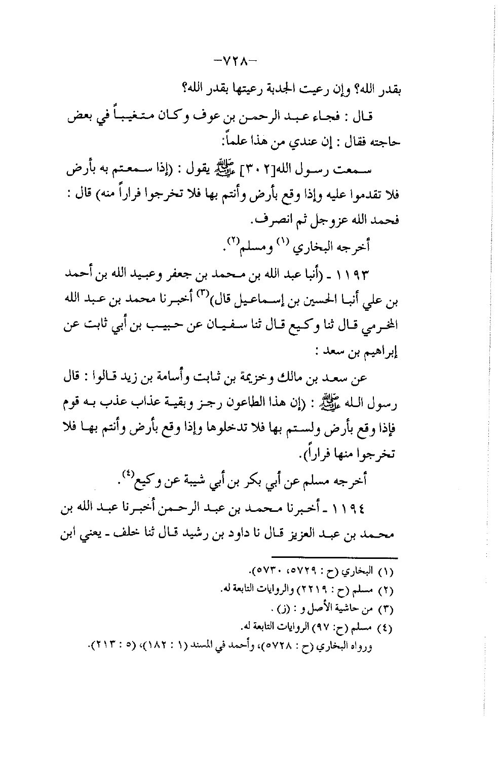 1193 - أنبا عَبْدُ اللَّهِ بْنُ مُحَمَّدِ بْنِ جَعْفَرٍ , وَعُبَيْدُ اللَّهِ بْنُ أَحْمَدَ بْنِ عَلِيٍّ , أنبا الْحُسَيْنُ بْنُ إِسْمَاعِيلَ، قَالَ: أَخْبَرَنَا مُحَمَّدُ بْنُ عَبْدِ اللَّهِ الْمُخَرِّمِيُّ، قَالَ: ثنا وَكِيعٌ، قَالَ: ثنا سُفْيَانُ , عَنْ حَبِيبِ بْنِ أَبِي ثَابِتٍ , عَنْ إِبْرَاهِيمَ بْنِ سَعْدٍ , عَنْ سَعْدِ بْنِ مَالِكٍ , وَخُزَيْمَةَ بْنِ ثَابِتٍ , وَأُسَامَةَ بْنِ زَيْدٍ، قَالُوا: قَالَ رَسُولُ اللَّهِ صَلَّى اللهُ عَلَيْهِ وَسَلَّمَ: «إِنَّ هَذَا §الطَّاعُونَ رِجْزٌ وَبَقِيَّةُ عَذَابٍ عُذِّبَ بِهِ قَوْمٌ، فَإِذَا وَقَعَ بِأَرْضٍ وَلَسْتُمْ بِهَا فَلَا تَدْخُلُوهَا، وَإِذَا وَقَعَ بِأَرْضٍ وَأَنْتُمْ بِهَا فَلَا تَخْرُجُوا مِنْهَا فِرَارًا»