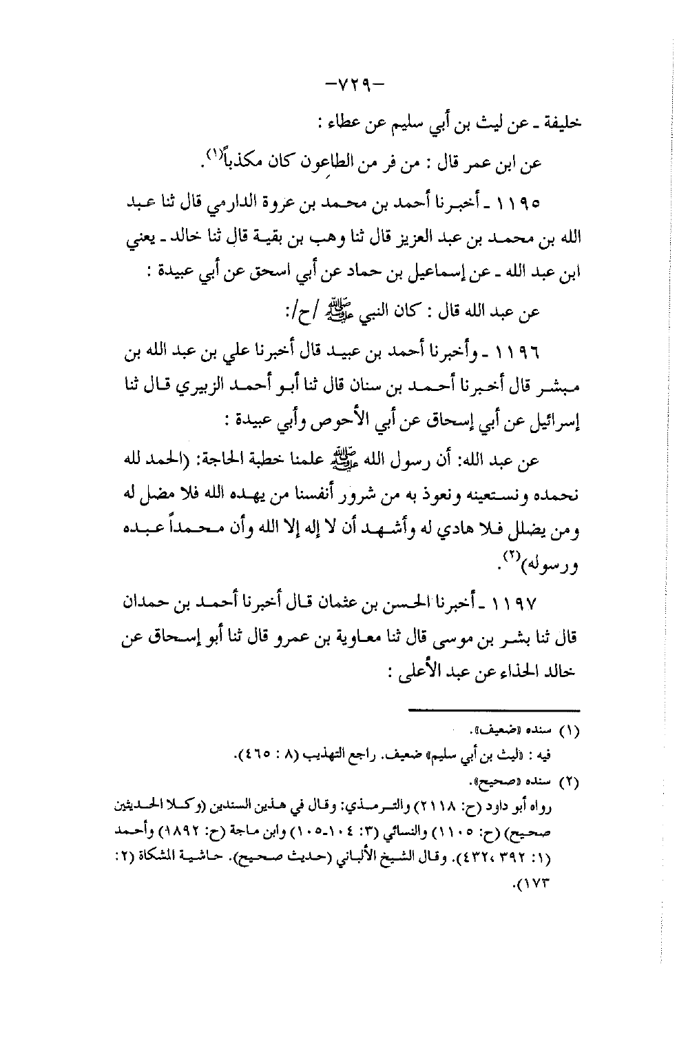1196 - وَأَخْبَرَنَا أَحْمَدُ بْنُ عُبَيْدٍ، قَالَ: أَخْبَرَنَا عَلِيُّ بْنُ عَبْدِ اللهِ بْنِ مُبَشِّرٍ، قَالَ: أَخْبَرَنَا أَحْمَدُ بْنُ سِنَانٍ، قَالَ: ثنا أَبُو أَحْمَدَ الزُّبَيْرِيُّ، قَالَ: ثنا إِسْرَائِيلُ , عَنْ أَبِي إِسْحَاقَ , عَنْ أَبِي الْأَحْوَصِ , وَأَبِي عُبَيْدَةَ، عَنْ عَبْدِ اللَّهِ أَنَّ رَسُولَ اللَّهِ صَلَّى اللهُ عَلَيْهِ وَسَلَّمَ عَلَّمَنَا خُطْبَةَ الْحَاجَةِ: «§الْحَمْدُ للَّهِ نَحْمَدُهُ وَنَسْتَعِينُهُ وَنَعُوذُ بِهِ مِنْ شُرُورِ أَنْفُسِنَا، مِنْ يَهْدِهِ اللَّهُ فَلَا مُضِلَّ لَهُ، وَمَنْ يُضْلِلْ فَلَا هَادِيَ لَهُ، وَأَشْهَدُ أَنْ لَا إِلَهَ إِلَّا اللَّهُ وَأَنَّ مُحَمَّدًا عَبْدُهُ وَرَسُولُهُ»