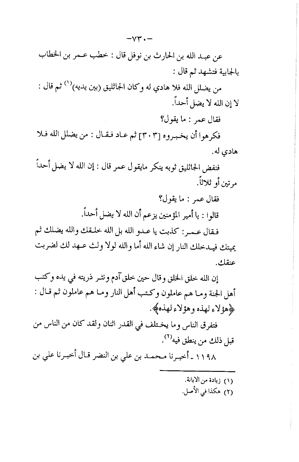 1198 - أَخْبَرَنَا مُحَمَّدُ بْنُ عَلِيِّ بْنِ النَّضْرِ، قَالَ: أَخْبَرَنَا عَلِيُّ بْنُ -[731]- عَبْدِ اللَّهِ بْنِ مُبَشِّرٍ، قَالَ: ثنا مُحَمَّدُ بْنُ عُبَادَةَ، قَالَ: ثنا يَزِيدُ بْنُ هَارُونَ، قَالَ: أَخْبَرَنَا سُفْيَانُ الثَّوْرِيُّ , عَنْ خَالِدٍ الْحَذَّاءِ , عَنْ عَبْدِ اللَّهِ بْنِ الْحَارِثِ، قَالَ: قَامَ عُمَرُ بْنُ الْخَطَّابِ بِالْجَابِيَةِ خَطِيبًا فَقَالَ فِي خُطْبَتِهِ: مِنْ §يَهْدِي اللَّهُ فَلَا مُضِلَّ لَهُ، وَمَنْ يُضْلِلْ فَلَا هَادِيَ لَهُ، وَعِنْدَهُ الْجَاثَلِيقُ - يَعْنِي يَسْمَعُ مَا يَقُولُ - قَالَ: فَنَفَضَ ثَوْبَهُ كَهَيْئَةِ الْمُنْكَرِ فَقَالَ عُمَرُ: مَا يَقُولُ؟ قَالَ: يَا أَمِيرَ الْمُؤْمِنِينَ يَزْعُمُ أَنَّ اللَّهَ لَا يُضِلُّ أَحَدًا، قَالَ: كَذَبْتَ يَا عَدُوَّ اللَّهِ بَلِ اللَّهُ خَلَقَكَ وَهُوَ أَضَلَّكَ وَهُوَ يُدْخِلُكَ النَّارَ إِنْ شَاءَ اللَّهُ، أَمَا وَاللَّهِ لَوْلَا وَلْثُ عَقْدٍ لَكَ لَضَرَبْتُ عُنُقَكَ، إِنَّ اللَّهَ خَلَقَ الْخَلْقَ فَخَلَقَ أَهْلَ الْجَنَّةِ وَمَا هُمْ عَامِلُونَ، وَخَلَقَ أَهْلَ النَّارِ وَمَا هُمْ عَامِلُونَ، قَالَ: هَؤُلَاءِ لِهَذِهِ، وَهَؤُلَاءِ لِهَذِهِ