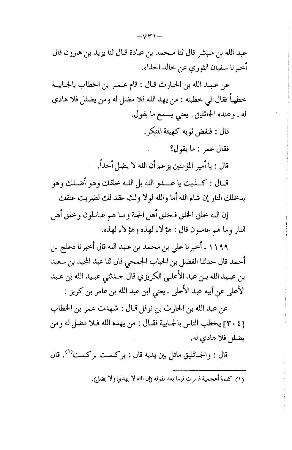 1199 - أَخْبَرَنَا عَلِيُّ بْنُ مُحَمَّدِ بْنِ عَبْدِ اللَّهِ، قَالَ: أَخْبَرَنَا دَعْلَجُ بْنُ أَحْمَدَ، قَالَ: حَدَّثَنَا الْفَضْلُ بْنُ الْحُبَابِ الْجُمَحِيُّ، قَالَ: ثنا عَبْدُ الْمَجِيدِ بْنُ سَعِيدِ بْنِ عُبَيْدِ اللَّهِ بْنِ عَبْدِ الْأَعْلَى الْكَرِيزِيُّ، قَالَ: حَدَّثَنِي عُبَيْدُ اللَّهِ بْنُ عَبْدِ الْأَعْلَى , عَنْ أَبِيهِ عَبْدِ الْأَعْلَى يَعْنِي ابْنَ عَبْدِ اللَّهِ بْنَ عَامِرِ بْنِ كَرِيزٍ , عَنْ عَبْدِ اللَّهِ بْنِ الْحَارِثِ بْنِ نَوْفَلٍ، قَالَ: شَهِدْتُ عُمَرَ بْنَ الْخَطَّابِ يَخْطُبُ النَّاسَ بِالْجَابِيَةِ فَقَالَ: مِنْ §يَهْدِهِ اللَّهُ فَلَا مُضِلَّ لَهُ، وَمَنْ يُضْلِلْ فَلَا هَادِيَ لَهُ قَالَ: وَالْجَاثَلِيقُ مَاثِلٌ بَيْنَ يَدَيْهِ قَالَ: بركست بركست قَالَ -[732]-: فَأَعَادَهَا الْجَاثَلِيقُ قَالَ: فَقَالَ عُمَرُ فِي الثَّالِثَةِ: مَا يَقُولُ عَدُوُّ اللَّهِ؟ قَالَ: يَقُولُ: إِنَّ اللَّهَ لَا يَهْدِي وَلَا يُضِلُّ، قَالَ: بَلَى اللَّهُ خَلَقَكَ وَاللَّهُ أَضَلَّكَ وَاللَّهُ يُكِبُّكَ فِي النَّارِ عَلَى مِنْخَرِكَ، أَمَا وَاللَّهِ لَوْلَا أَنَّ لَكَ عَهْدًا سَبَقَ لَضَرَبْتُ عُنُقَكَ. فَتَفَرَّقَ النَّاسُ يَوْمَئِذٍ وَمَا يَخْتَلِفُ فِي الْقَدَرِ اثْنَانِ