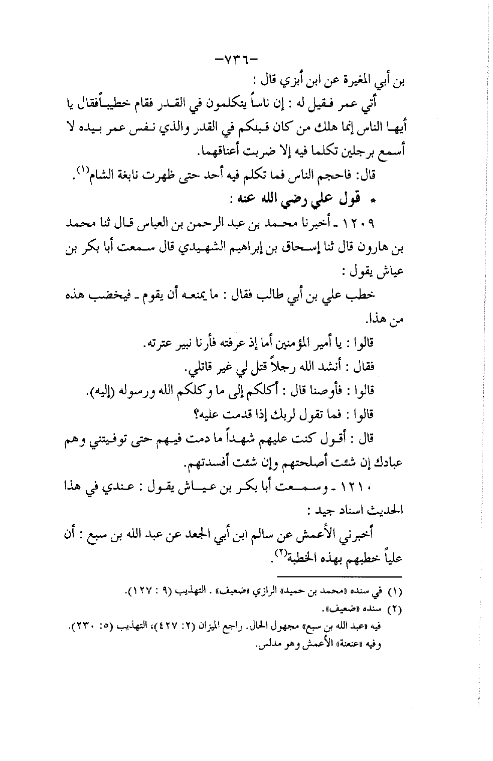 1210 - سَمِعْتُ أَبَا بَكْرِ بْنَ عَيَّاشٍ يَقُولُ: عِنْدِي فِي هَذَا الْحَدِيثِ إِسْنَادٌ جَيِّدٌ أَخْبَرَنِي الْأَعْمَشُ، عَنْ سَالِمِ بْنِ أَبِي الْجَعْدِ، عَنْ عَبْدِ اللَّهِ بْنِ سَبْعٍ أَنَّ عَلِيًّا خَطَبَهُمْ بِهَذِهِ الْخُطْبَةِ