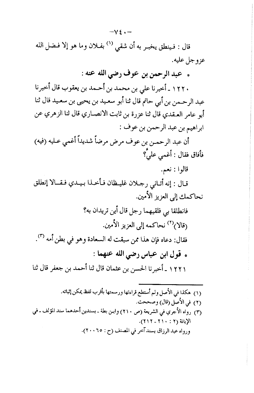1220 - أَخْبَرَنَا عَلِيُّ بْنُ مُحَمَّدِ بْنِ أَحْمَدَ بْنِ يَعْقُوبَ، قَالَ: أَخْبَرَنَا عَبْدُ الرَّحْمَنِ بْنُ أَبِي حَاتِمٍ، قَالَ: ثنا أَبُو سَعِيدِ بْنُ يَحْيَى بْنِ سَعِيدٍ، قَالَ: ثنا أَبُو عَامِرٍ الْعَقَدِيُّ، قَالَ: ثنا عَزْرَةُ بْنُ ثَابِتٍ الْأَنْصَارِيُّ، قَالَ: ثنا الزُّهْرِيُّ , عَنْ إِبْرَاهِيمَ بْنِ عَبْدِ الرَّحْمَنِ، أَنَّ عَبْدَ الرَّحْمَنِ بْنَ عَوْفٍ مَرِضَ مَرَضًا شَدِيدًا أُغْمِيَ عَلَيْهِ فَأَفَاقَ فَقَالَ: أُغْمِيَ عَلَيَّ؟ قَالُوا: نَعَمْ، قَالَ: إِنَّهُ §أَتَانِي رَجُلَانِ غَلِيظَانِ فَأَخَذَا بِيَدِي فَقَالَا: انْطَلِقْ نُحَاكِمْكَ إِلَى الْعَزِيزِ الْأَمِينِ، فَانْطَلَقَا بِي فَلَقِيَهُمَا رَجُلٌ قَالَ: أَيْنَ تُرِيدَانِ بِهِ؟ قَالَا: نُحَاكِمُهُ إِلَى الْعَزِيزِ الْأَمِينِ، فَقَالَ: دَعَاهُ فَإِنَّ هَذَا مِمَّنْ سَبَقَتْ لَهُ السَّعَادَةُ وَهُوَ فِي بَطْنِ أُمِّهِ