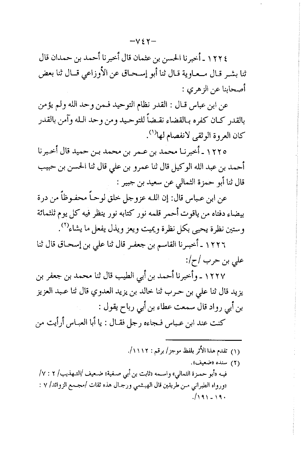 1224 - أَخْبَرَنَا الْحَسَنُ بْنُ عُثْمَانَ، قَالَ: أَخْبَرَنَا أَحْمَدُ بْنُ حَمْدَانَ، قَالَ: ثنا بِشْرٌ، قَالَ مُعَاوِيَةُ: ثنا أَبُو إِسْحَاقَ , عَنِ الْأَوْزَاعِيِّ، قَالَ: ثنا بَعْضُ أَصْحَابِنَا عَنِ الزُّهْرِيِّ , عَنِ ابْنِ عَبَّاسٍ قَالَ: §الْقَدَرُ نِظَامُ التَّوْحِيدِ، فَمَنْ وَحَّدَ اللَّهَ وَلَمْ يُؤْمِنْ بِالْقَدَرِ كَانَ كُفْرُهُ بِالْقَضَاءِ نَقْضًا لِلتَّوْحِيدِ، وَمَنْ وَحَّدَ اللَّهَ وَآمَنَ بِالْقَدَرِ كَانَ الْعُرْوَةُ الْوُثْقَى لَا انْفِصَامَ لَهَا