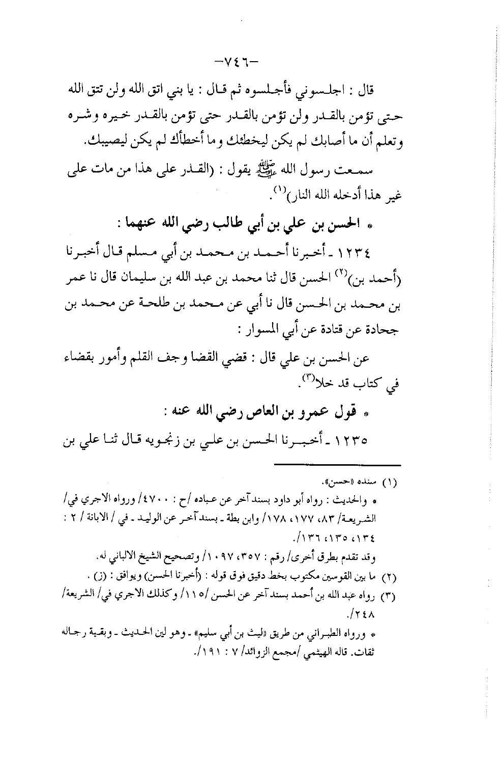 1234 - أَخْبَرَنَا أَحْمَدُ بْنُ مُحَمَّدِ بْنِ أَبِي مُسْلِمٍ، قَالَ: أَخْبَرَنَا أَحْمَدُ بْنُ الْحَسَنِ، قَالَ: ثنا مُحَمَّدُ بْنُ عَبْدِ اللَّهِ بْنِ سُلَيْمَانَ، قَالَ: نا عُمَرُ بْنُ مُحَمَّدِ بْنِ الْحَسَنِ، قَالَ: نا أَبِي , عَنْ مُحَمَّدِ بْنِ طَلْحَةَ , عَنْ مُحَمَّدِ بْنِ جُحَادَةَ , عَنْ قَتَادَةَ , عَنْ أَبِي الْمِسْوَارِ , عَنِ الْحَسَنِ بْنِ عَلِيٍّ قَالَ: §قُضِيَ الْقَضَاءُ وَجَفَّ الْقَلَمُ وَأُمُورٌ بِقَضَاءٍ فِي كِتَابٍ قَدْ خَلَا