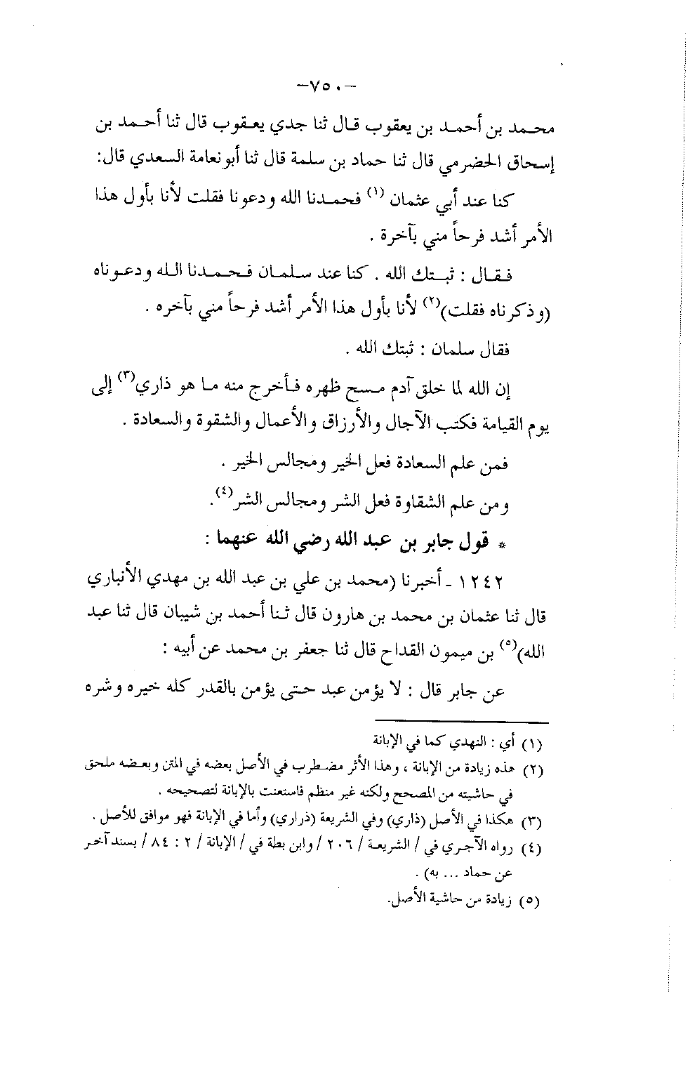 أَخْبَرَنَا مُحَمَّدُ بْنُ عَلِيِّ بْنِ عَبْدِ اللَّهِ بْنِ مَهْدِيٍّ الْأَنْبَارِيُّ، قَالَ: ثنا عُثْمَانُ بْنُ مُحَمَّدِ بْنِ هَارُونَ، قَالَ: ثنا أَحْمَدُ بْنُ شَيْبَانَ، قَالَ: ثنا عَبْدُ اللَّهِ بْنُ مَيْمُونٍ الْقَدَّاحُ، قَالَ: ثنا جَعْفَرُ بْنُ مُحَمَّدٍ , عَنْ أَبِيهِ , عَنْ جَابِرٍ قَالَ: §لَا يُؤْمِنُ عَبْدٌ حَتَّى يُؤْمِنَ بِالْقَدَرِ كُلِّهِ خَيْرِهِ وَشَرِّهِ -[751]- مَا أَصَابَهُ لَمْ يَكُنْ لِيُخْطِئَهُ، وَمَا أَخْطَأَهُ لَمْ يَكُنْ لِيُصِيبَهُ