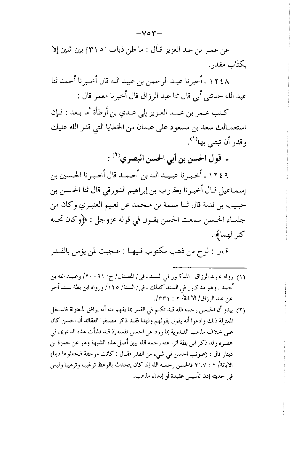 1248 - أَخْبَرَنَا عَبْدُ الرَّحْمَنِ بْنُ عَبْدِ اللَّهِ، قَالَ: أَخْبَرَنَا أَحْمَدُ , ثنا عَبْدُ اللَّهِ , حَدَّثَنِي أَبِي، قَالَ: ثنا عَبْدُ الرَّزَّاقِ، قَالَ: أَخْبَرَنَا مَعْمَرٌ قَالَ: كَتَبَ عُمَرُ بْنُ عَبْدِ الْعَزِيزِ إِلَى عَدِيِّ بْنِ أَرْطَأَةَ: أَمَّا بَعْدُ فَإِنَّ اسْتِعْمَالَكَ سَعْدَ بْنَ مَسْعُودٍ عَلَى عُمَانَ مِنَ §الْخَطَايَا الَّتِي قَدَّرَ اللَّهُ عَلَيْكَ وَقَدَّرَ أَنْ تُبْتَلَى بِهَا