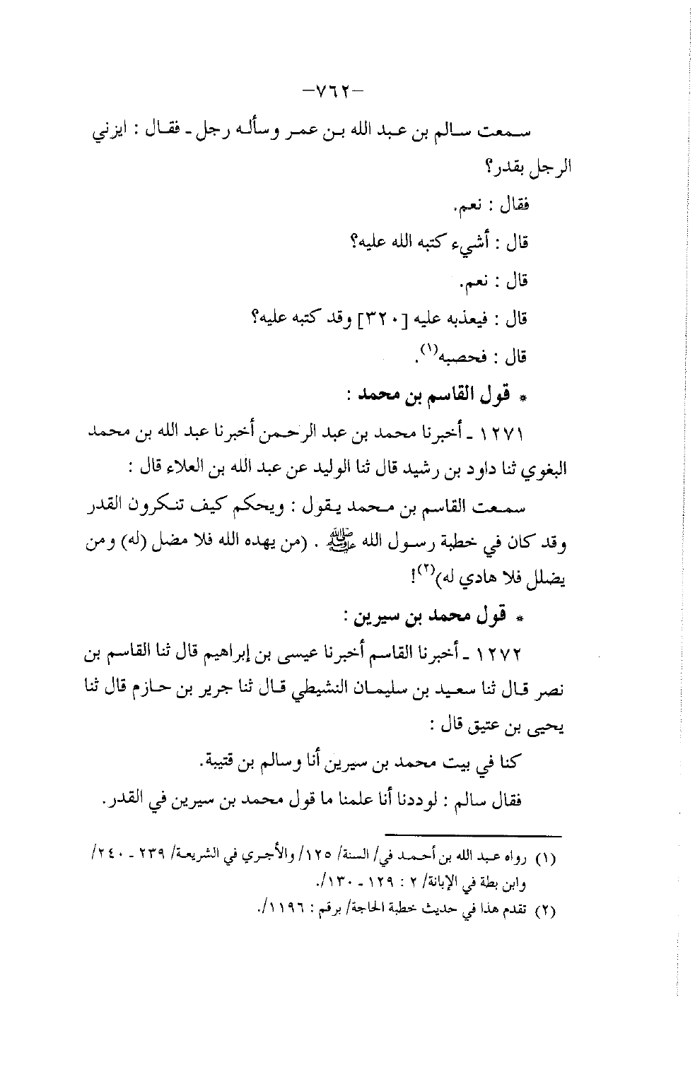 1271 - أَخْبَرَنَا مُحَمَّدُ بْنُ عَبْدِ الرَّحْمَنِ , أَخْبَرَنَا عَبْدُ اللَّهِ بْنُ مُحَمَّدٍ الْبَغَوِيُّ , ثنا دَاوُدُ بْنُ رُشَيْدٍ، قَالَ: ثنا الْوَلِيدُ , عَنْ عَبْدِ اللَّهِ بْنِ الْعَلَاءِ، قَالَ: سَمِعْتُ الْقَاسِمَ بْنَ مُحَمَّدٍ يَقُولُ: وَيْحَكُمْ كَيْفَ تُنْكِرُونَ الْقَدَرَ وَقَدْ كَانَ فِي خُطْبَةِ رَسُولِ اللَّهِ صَلَّى اللهُ عَلَيْهِ وَسَلَّمَ: «مِنْ §يَهْدِهِ اللَّهُ فَلَا مُضِلَّ لَهُ، وَمَنْ يُضْلِلْ فَلَا هَادِيَ لَهُ»